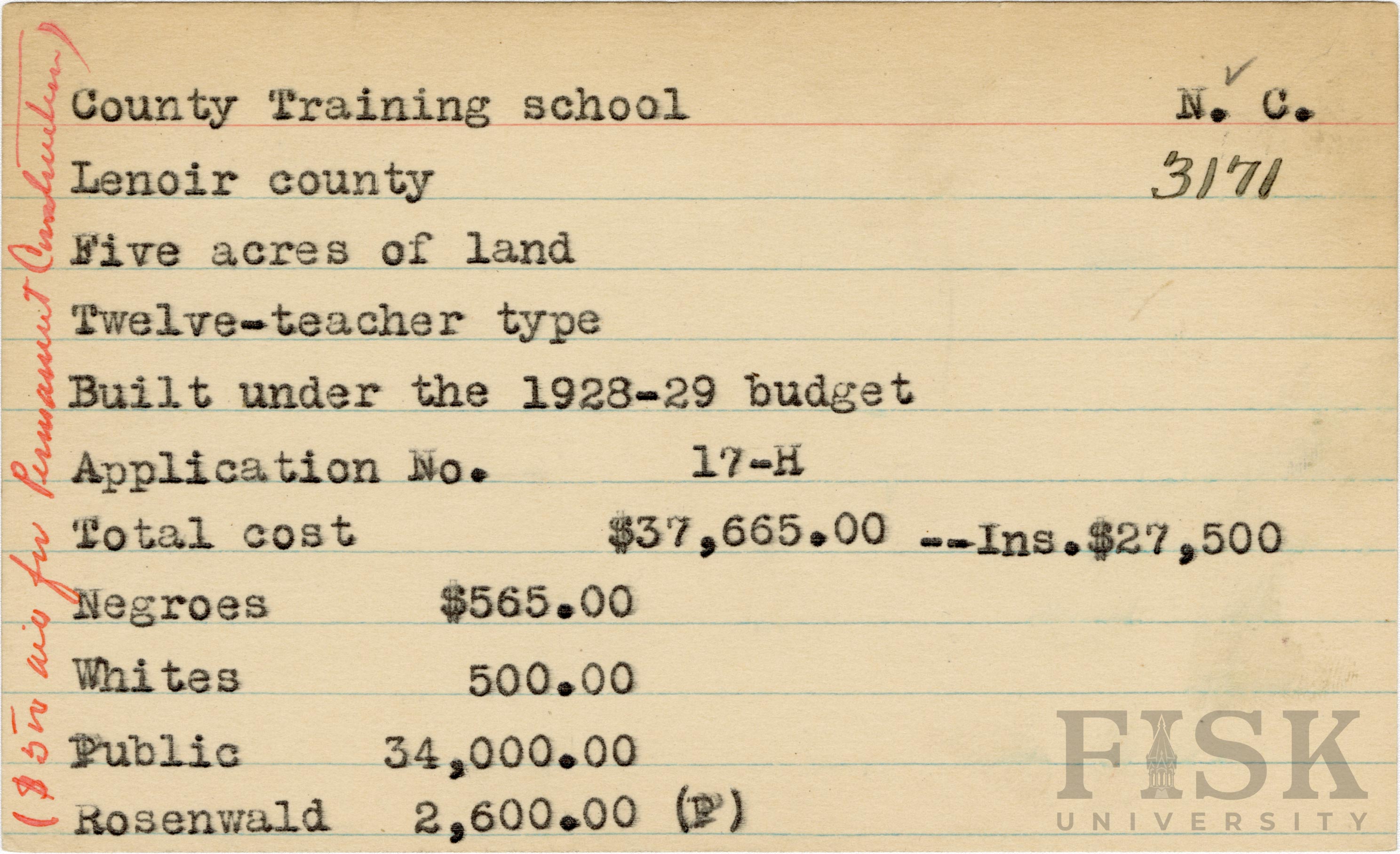 School card for County Training School in Lenoir County, North Carolina with a section added to the budget contributions that says, "Ins. $27,500" and a handwritten note on the far left of the card says, "($500 aid for permanent construction)"