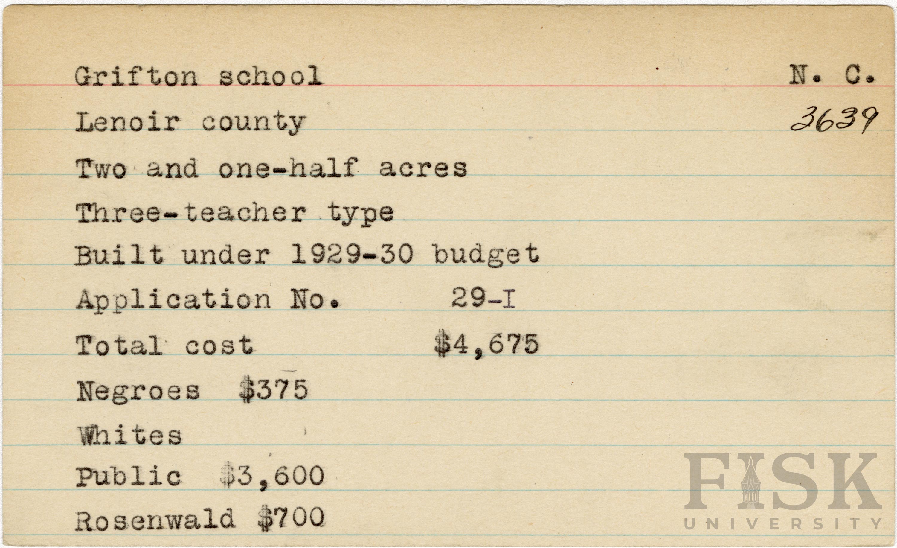 - Julius Rosenwald Fund--Buildings, African American schools--History--20th century, African American schools--Grifton School