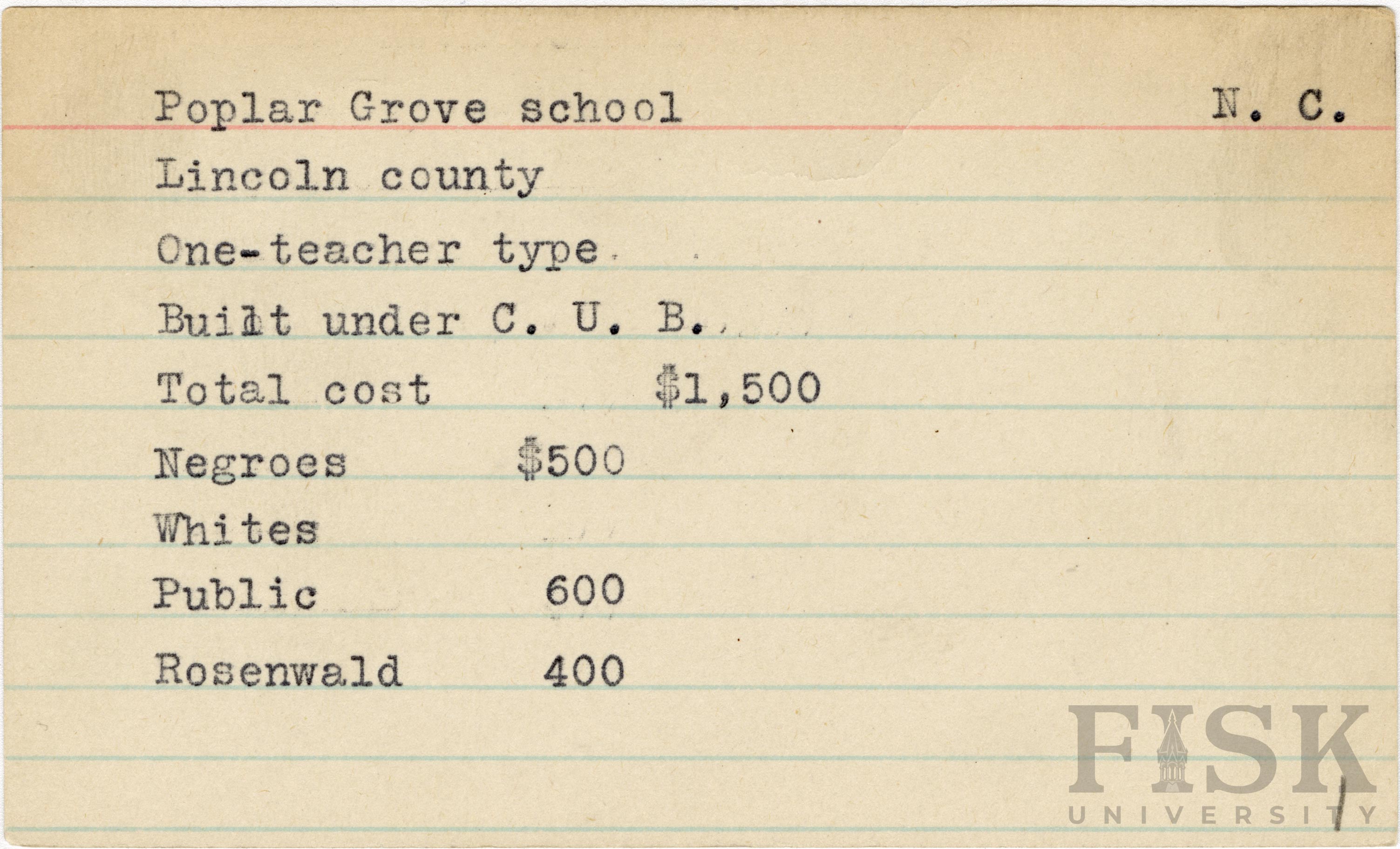 School card for Poplar Grove School in Lincoln County, North Carolina
