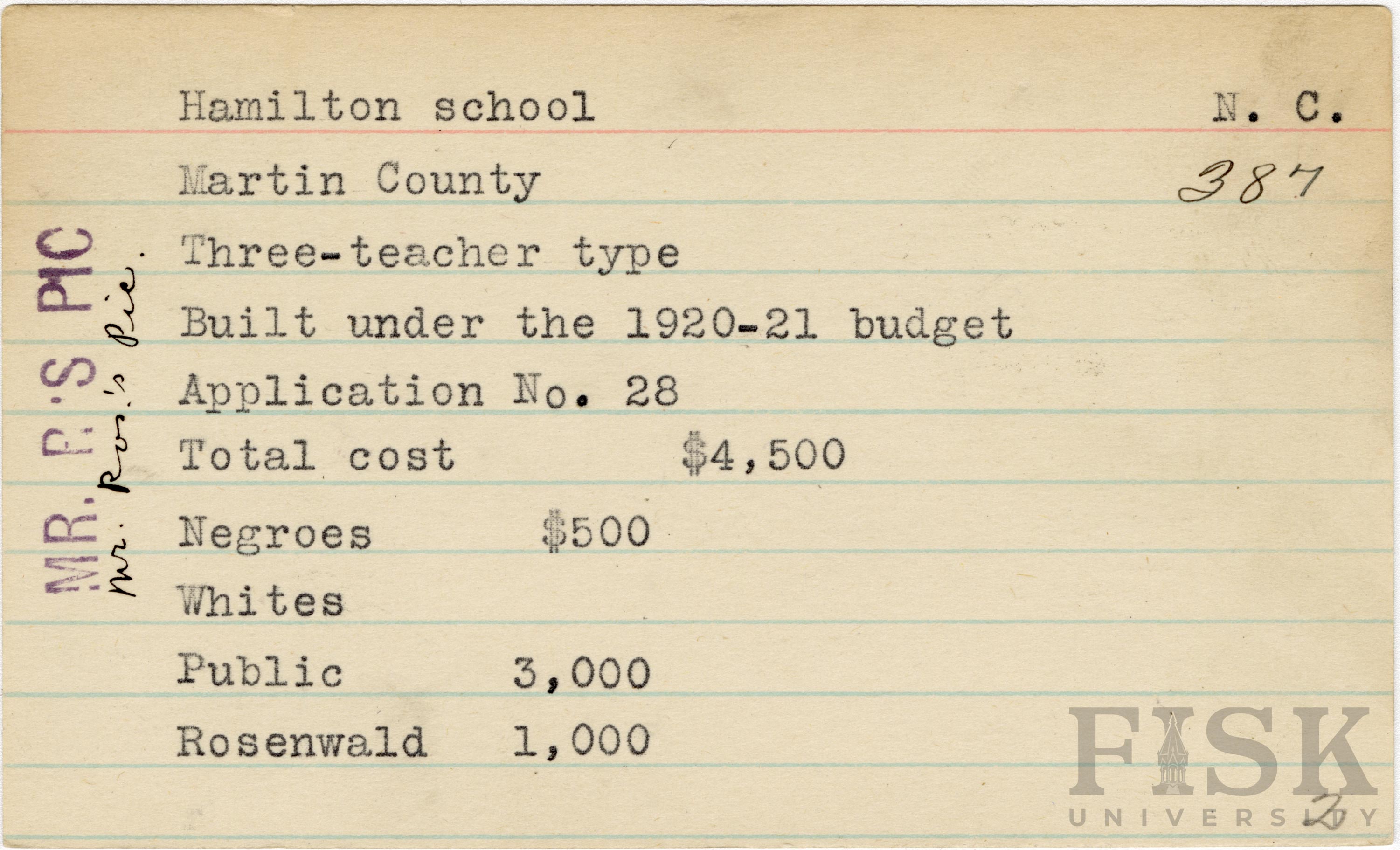 School card for Hamilton School in Martin County, North Carolina with notes on the far left of the card that say "Mr. R's Pic" and "Mr. Ros's Pic"