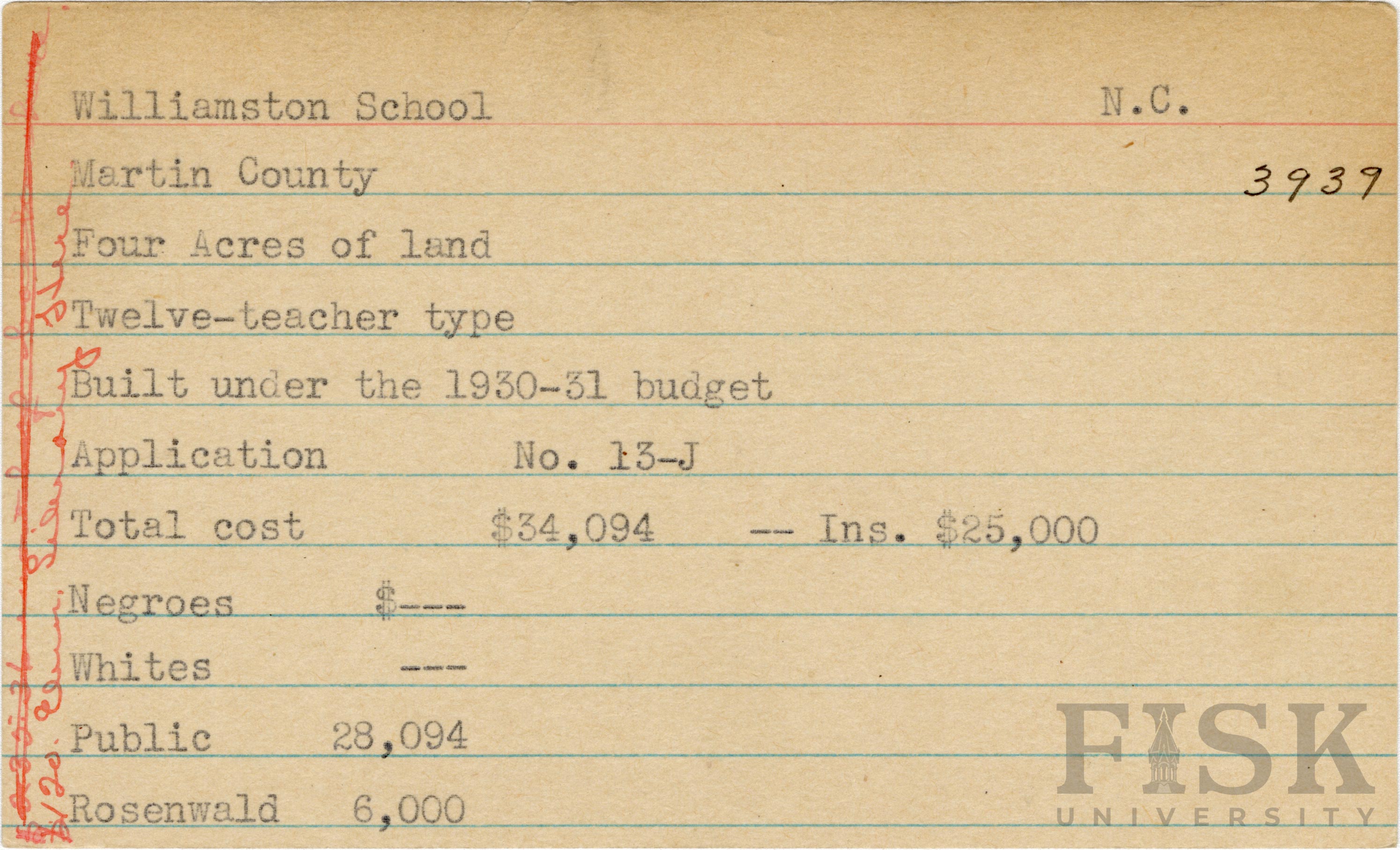 - Julius Rosenwald Fund--Buildings, African American schools--History--20th century, African American schools--Williamston School