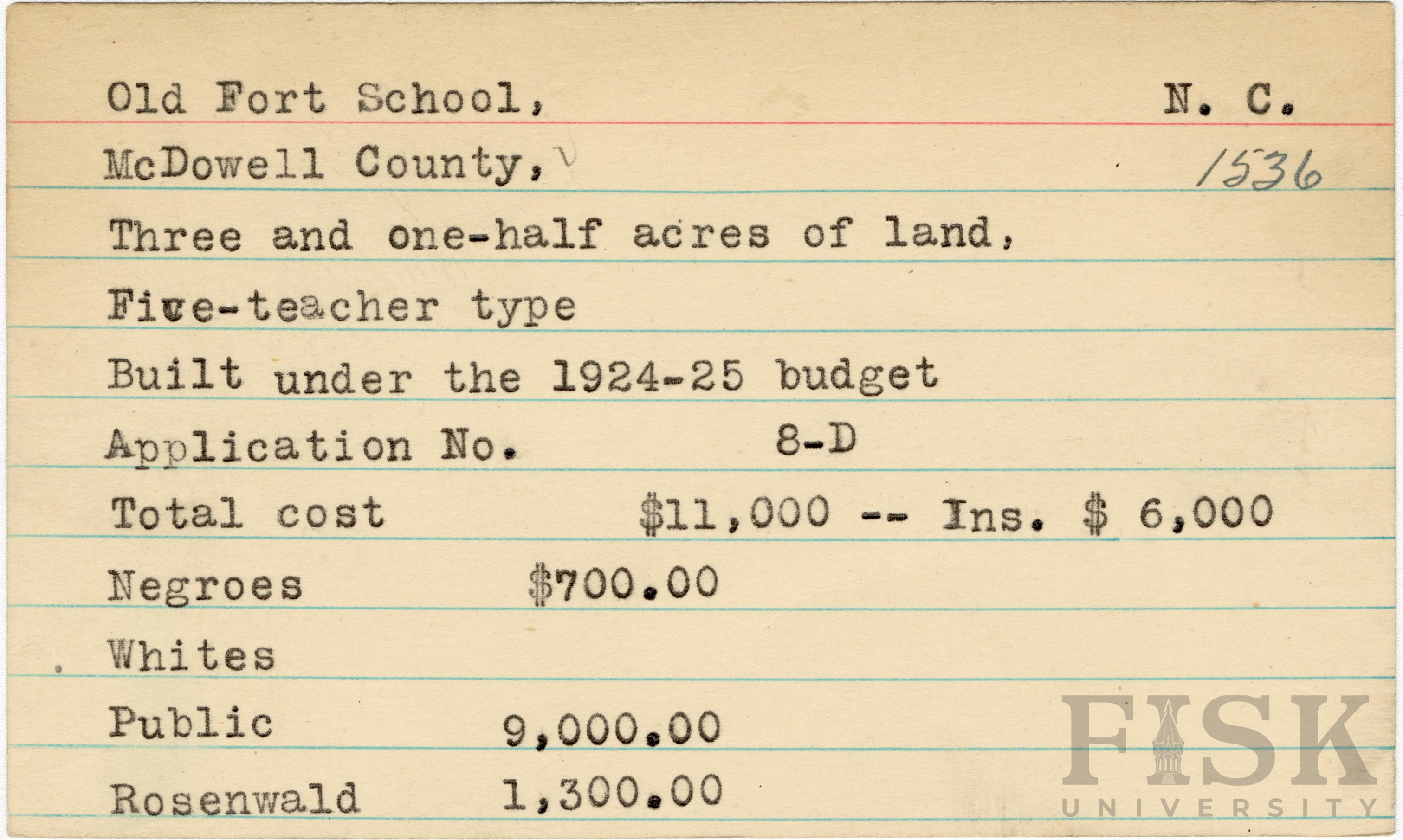 - School card for Old Fort School in McDowell County, North Carolina with a section added to the budget contributions that says, "Ins. $6,000"