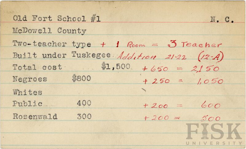 - Julius Rosenwald Fund--Buildings, African American schools--History--20th century, African American schools--Old Fort School No. 1