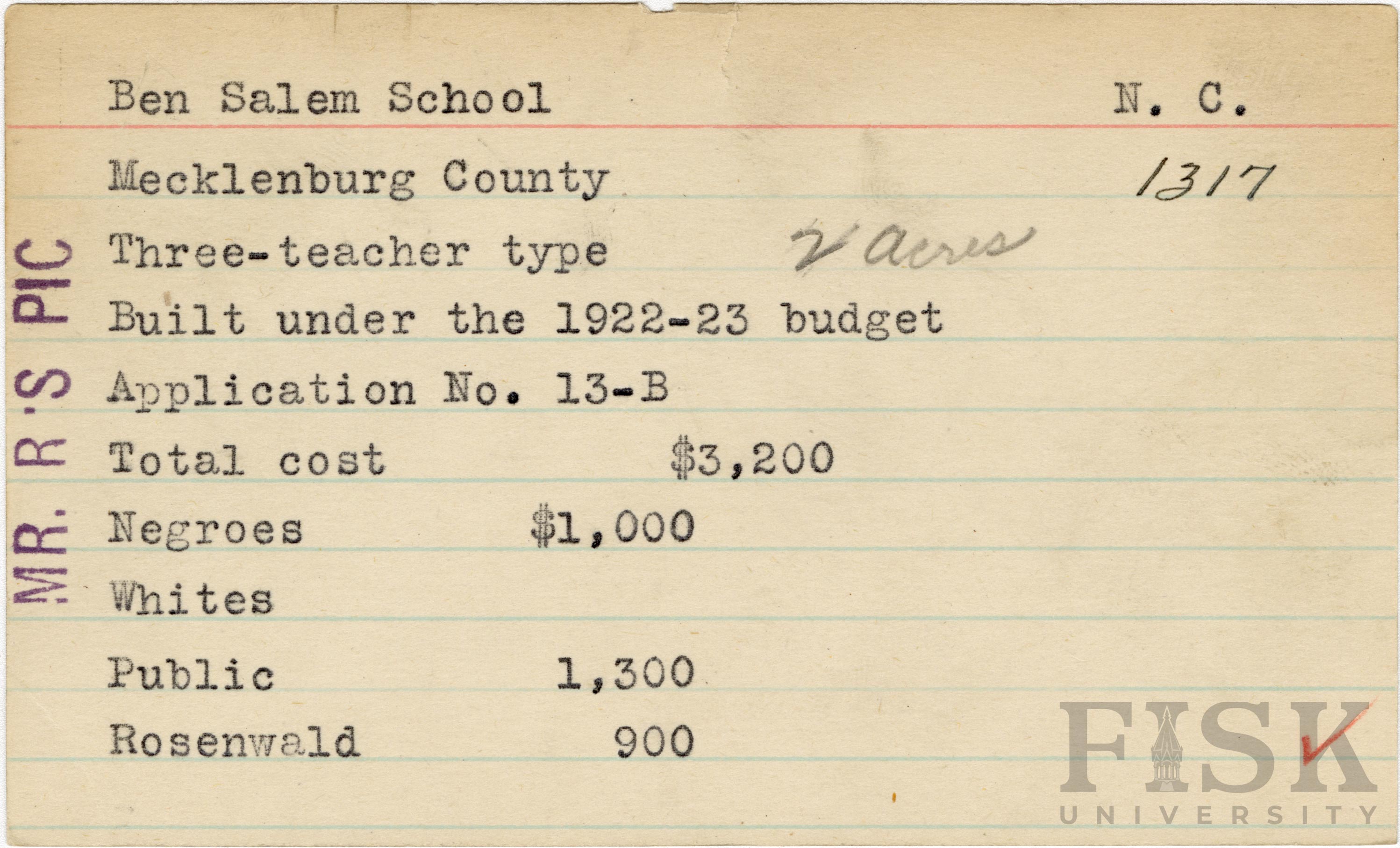 School card for Ben Salem School in Mecklenburg County, North Carolina with a note on the far left of the card that says, "Mr. R's Pic"