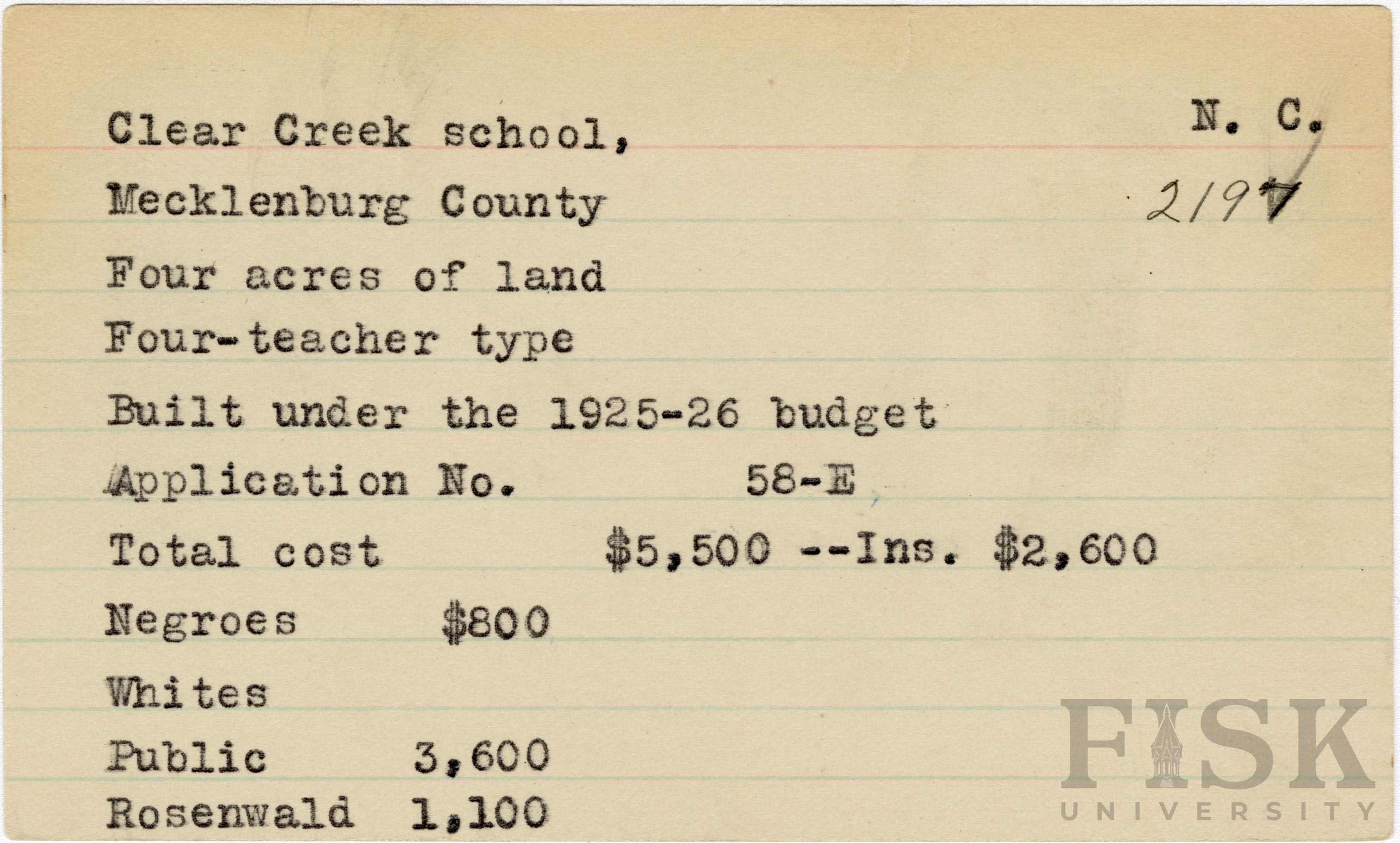 School card for Clear Creek School in Mecklenburg County, North Carolina with a section added to the budget contributions that says, "Ins. $2,600"