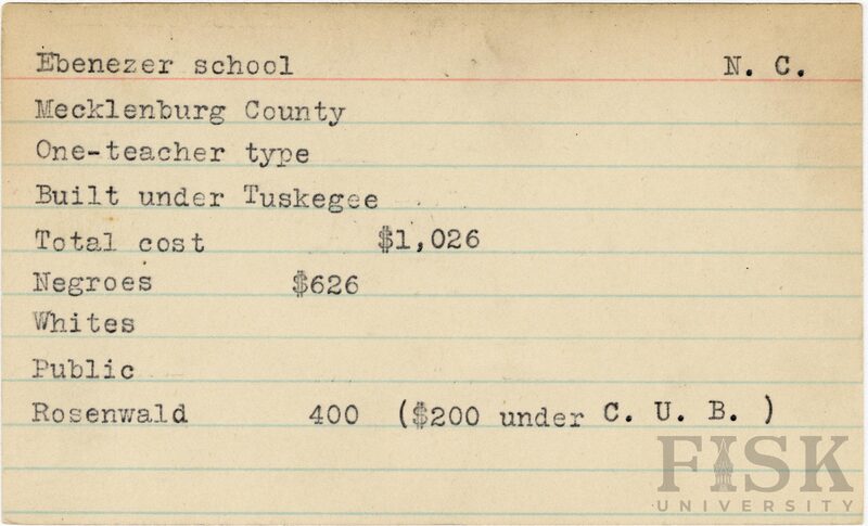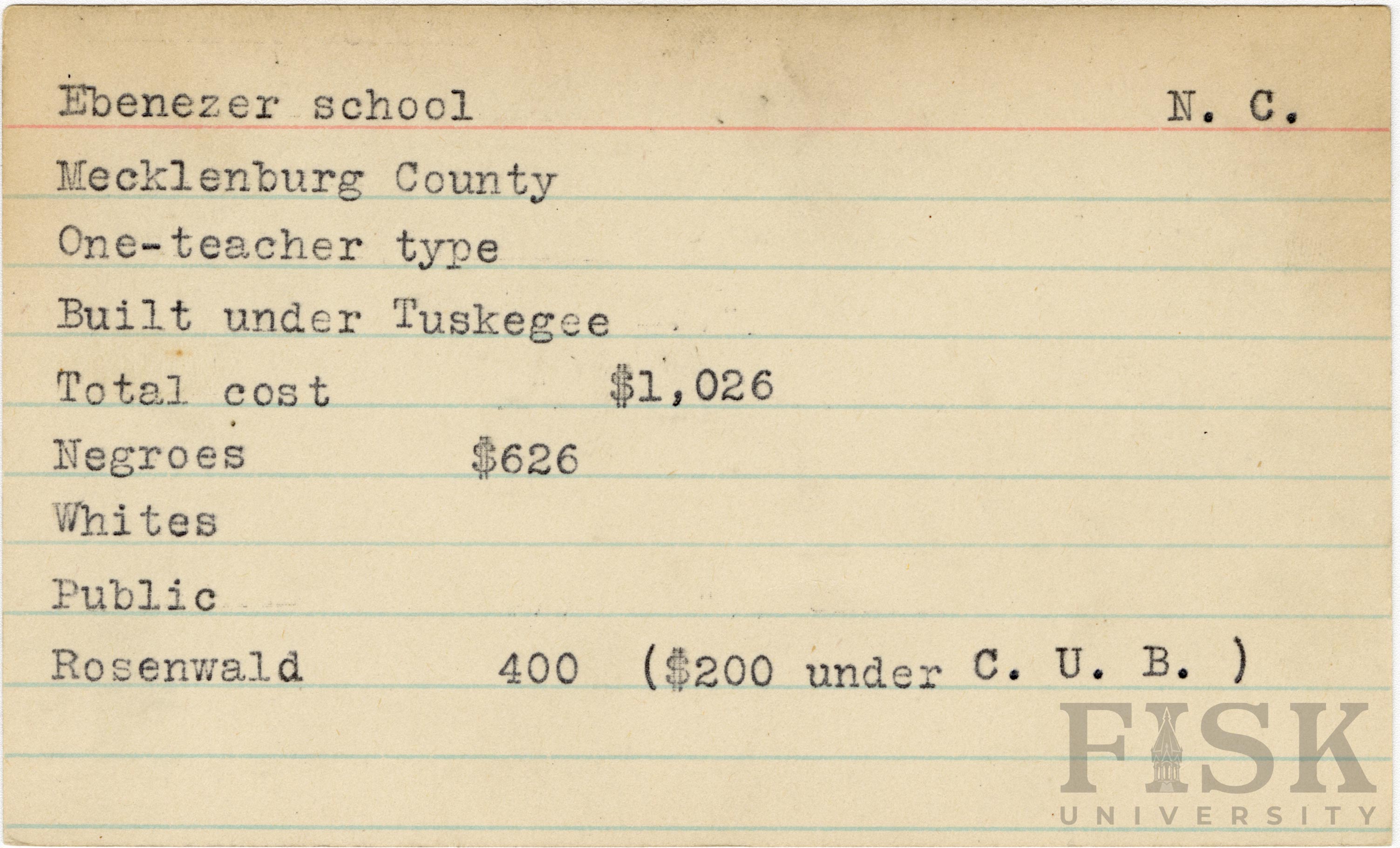 - School card for Ebenezer School in Mecklenburg County, North Carolina with a note added next to the Rosenwald budget contribution that says, "($200 under C.U.B.)"