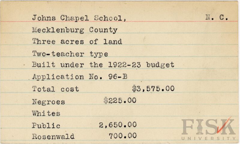 - Julius Rosenwald Fund--Buildings, African American schools--History--20th century, African American schools--Johns Chapel School