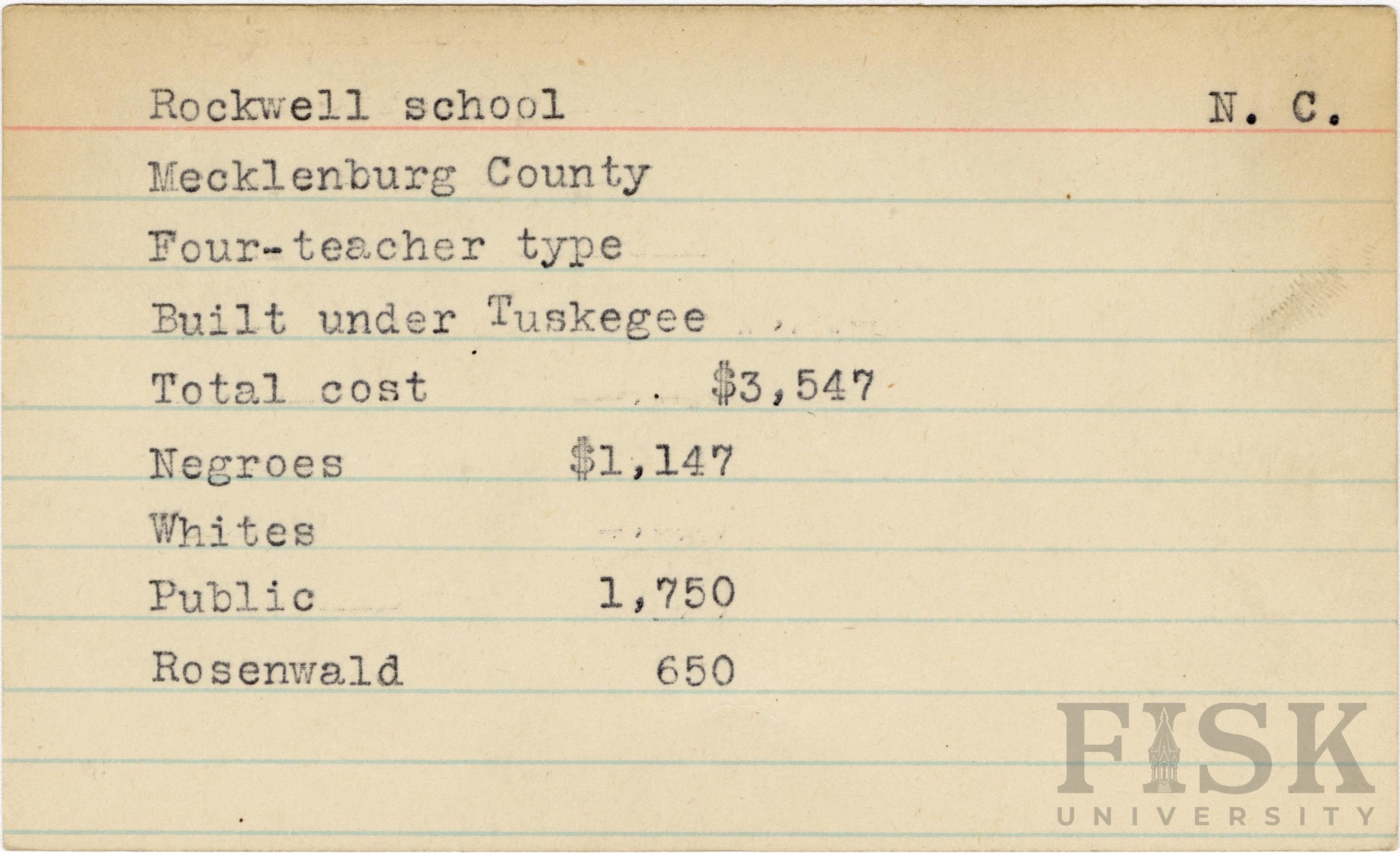 - School card for Rockwell School in Mecklenburg County, North Carolina