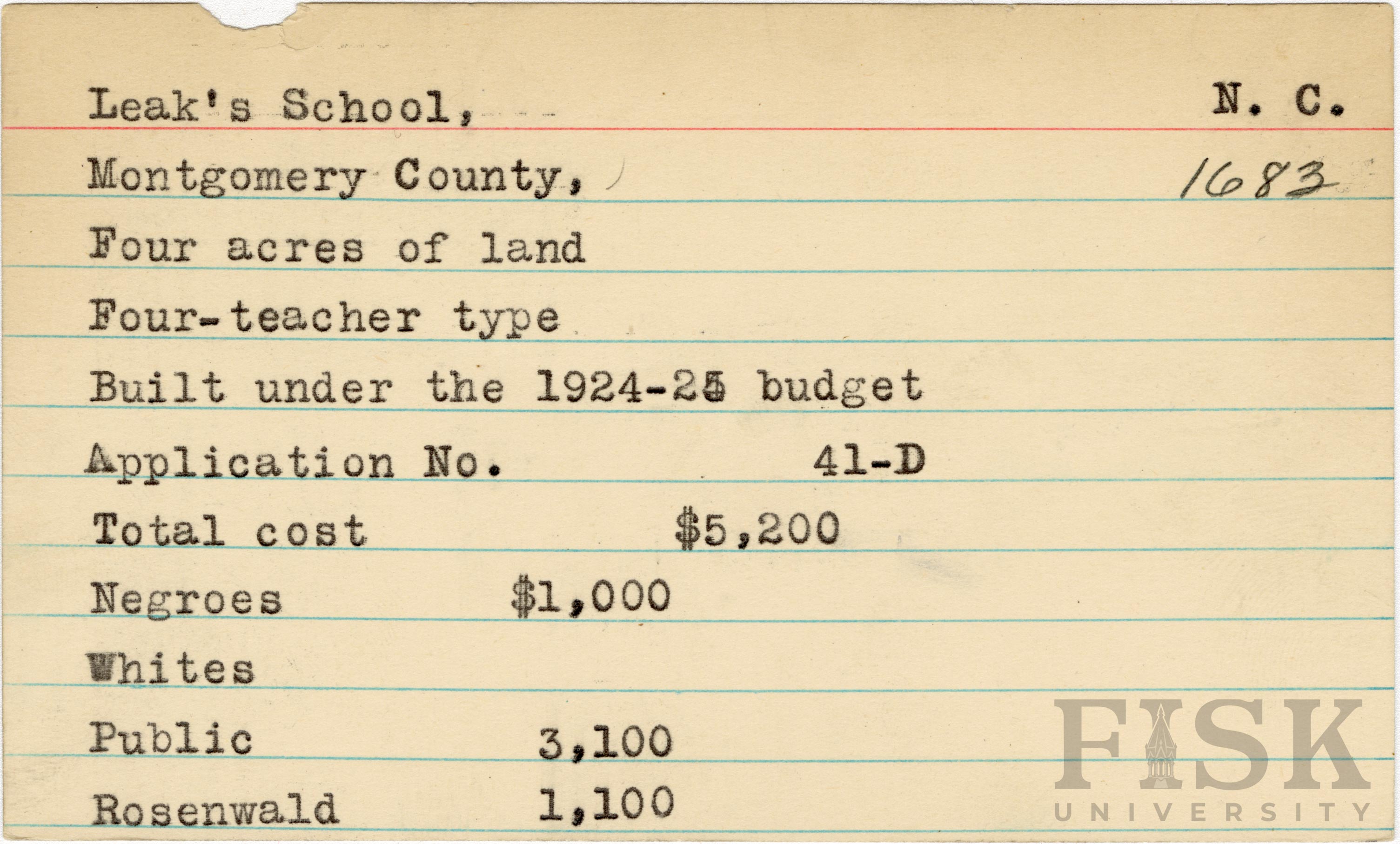 - Julius Rosenwald Fund--Buildings, African American schools--History--20th century, African American schools--Leak's School