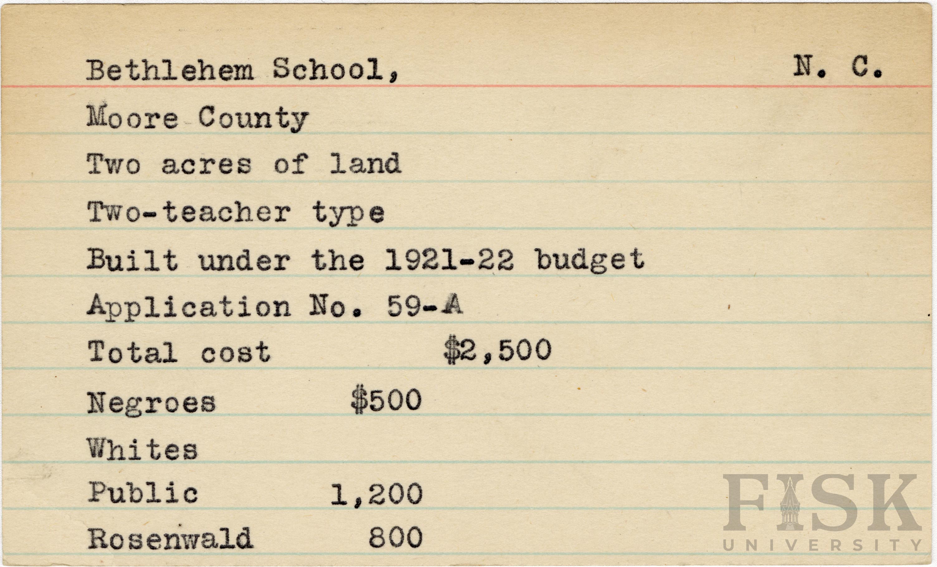 - School card for Bethlehem School in Moore County, North Carolina
