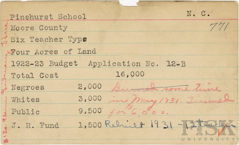 School card for Pinehurst School in Moore County, North Carolina with handwritten notes that say, "$120 elem library here," "burned some time in May 1931. Insured for $6,000," and "rebuilt 1931 - 12 teacher"
