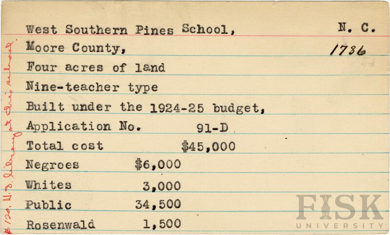 - School card for West Southern Pines School in Moore County, North Carolina with a note on the far left of the card that says, "$120 H.S. library at this school"