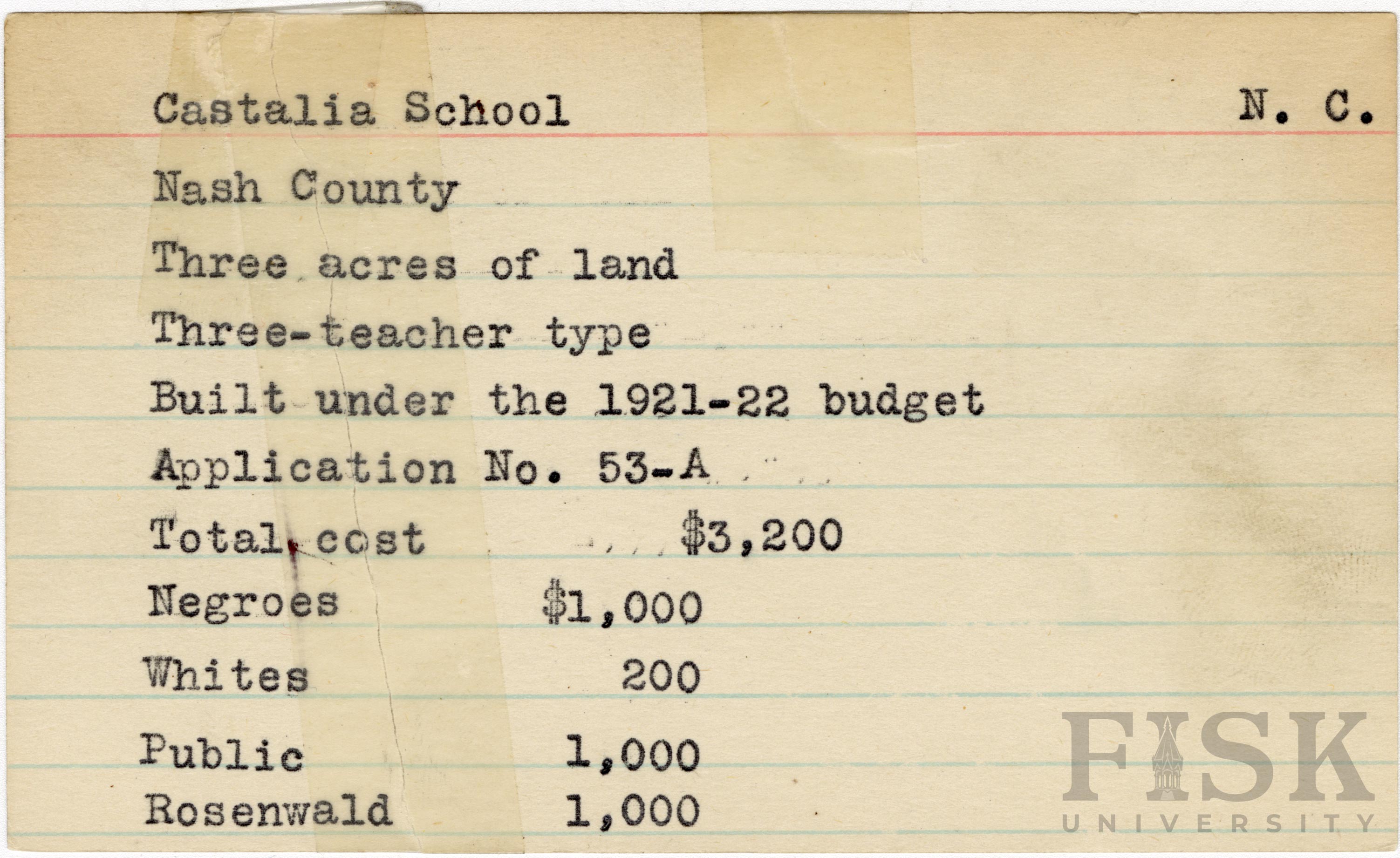 - Julius Rosenwald Fund--Buildings, African American schools--History--20th century, African American schools--Castalia School