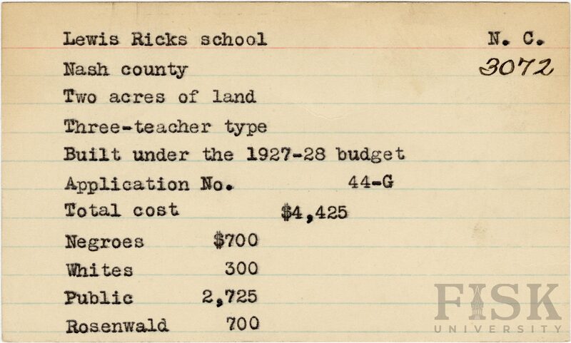 - School card for Lewis Ricks School in Nash County, North Carolina