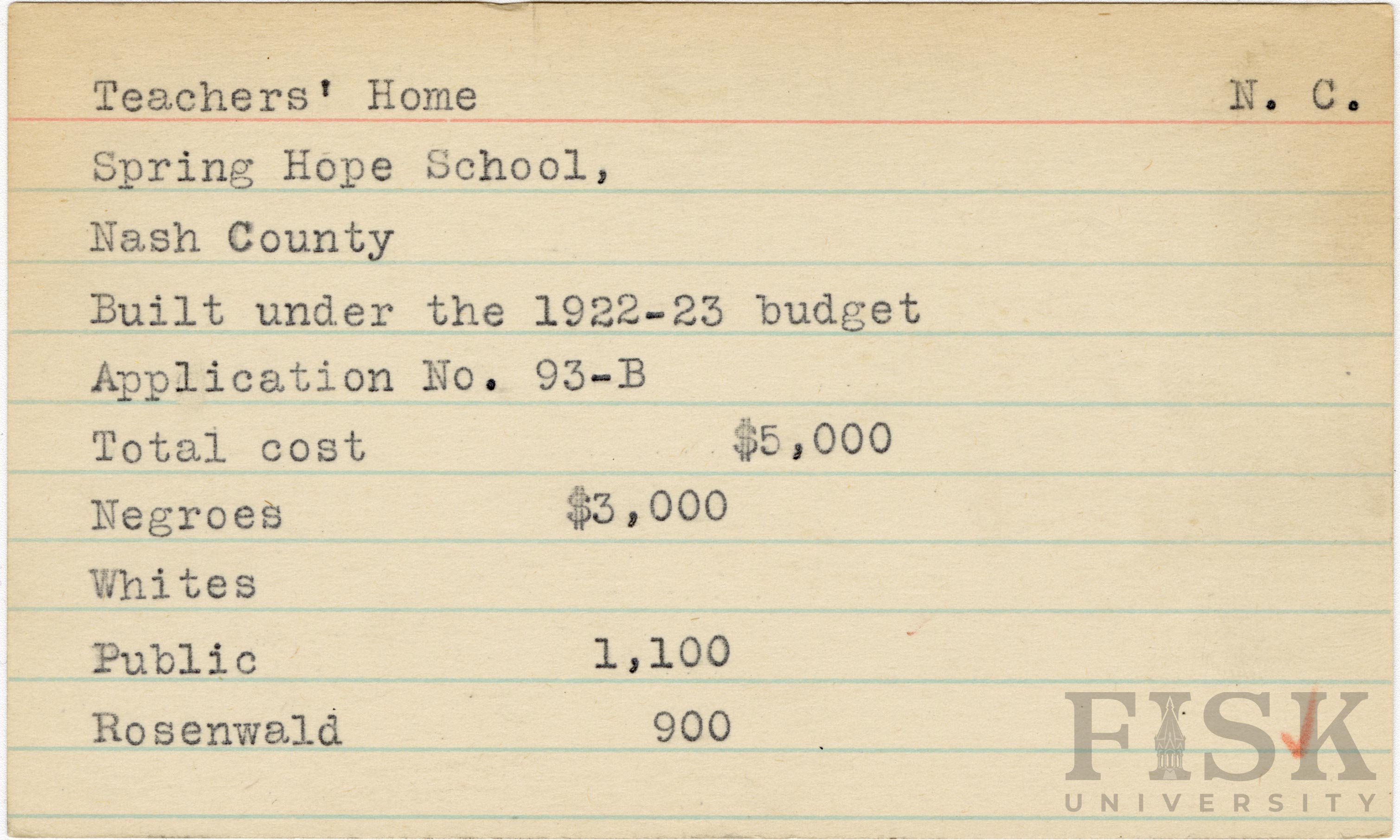 - School card for the teacher's home at Spring Hope School in Nash County, North Carolina
