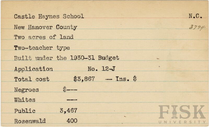 - Julius Rosenwald Fund--Buildings, African American schools--History--20th century, African American schools--Castle Haynes School