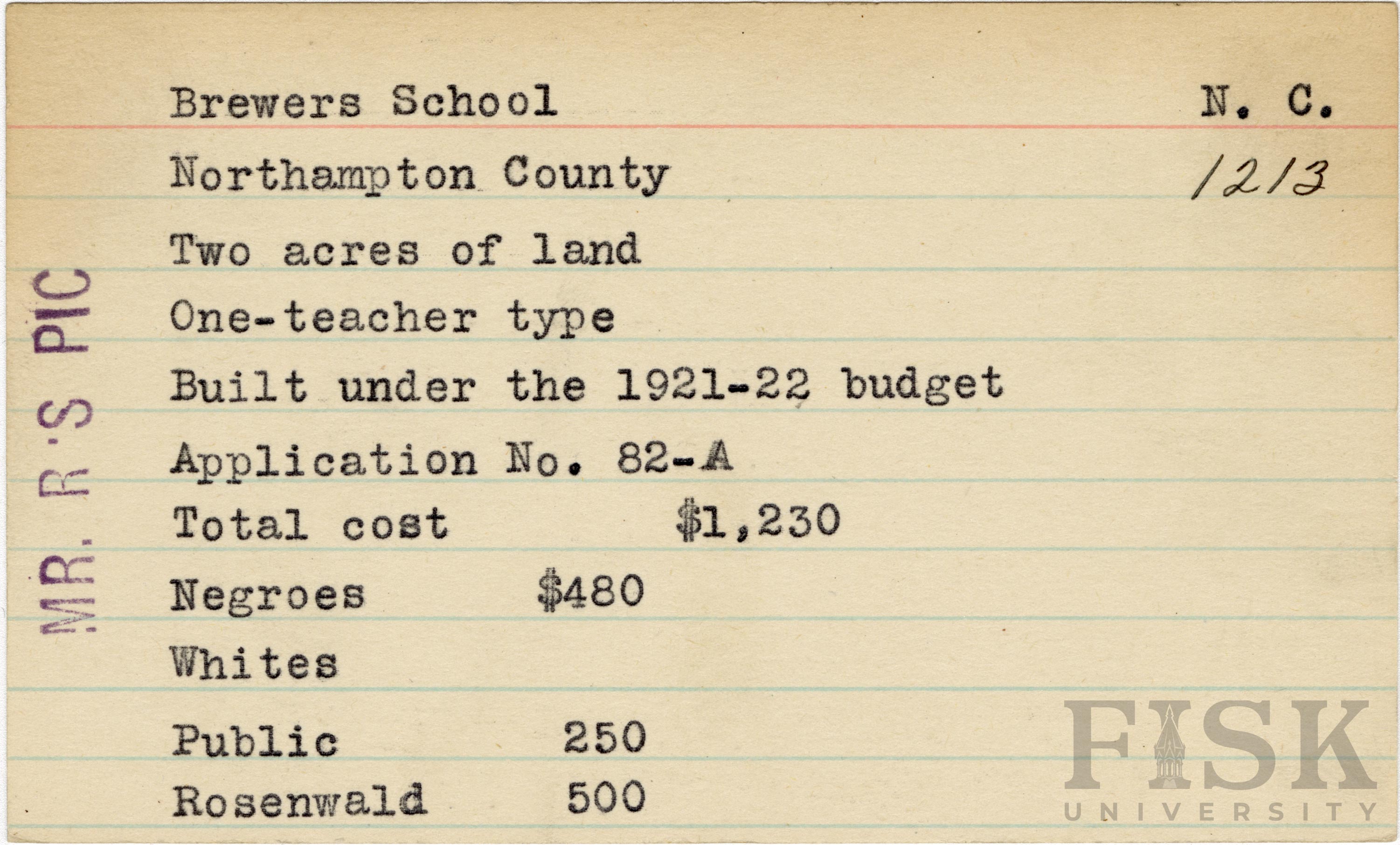 School card for Brewers School in Northampton County, North Carolina with a note on the far left of the card that says, "Mr. R's Pic"