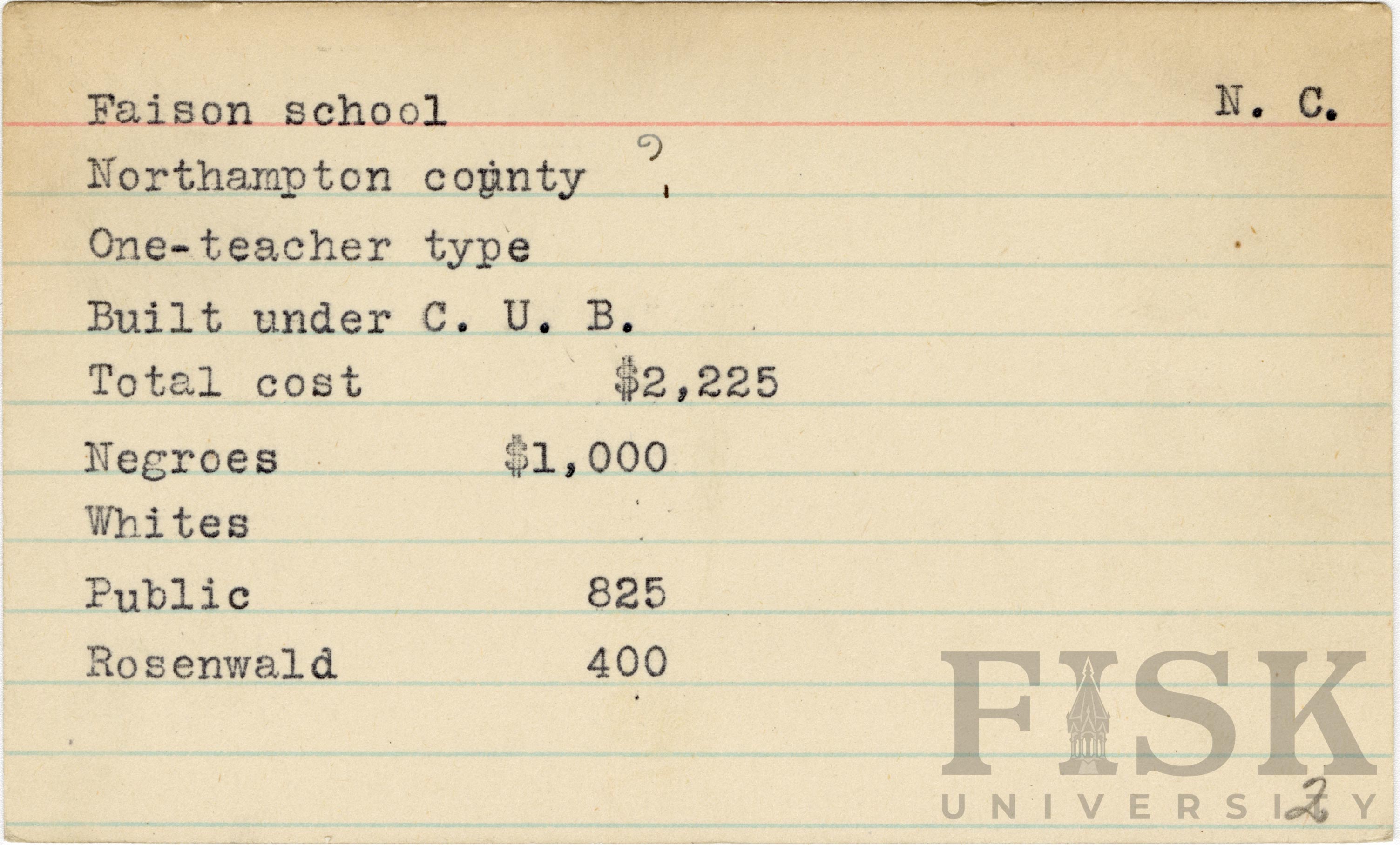 - Julius Rosenwald Fund--Buildings, African American schools--History--20th century, African American schools--Faison School