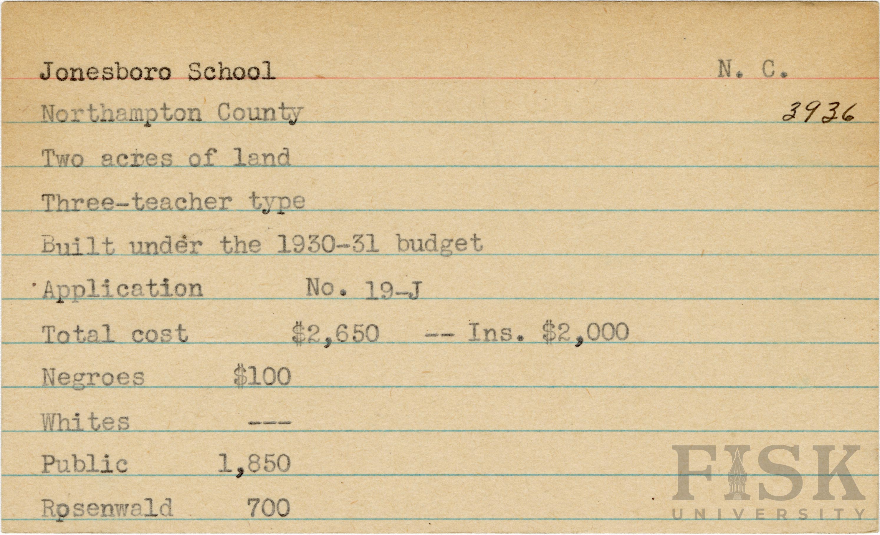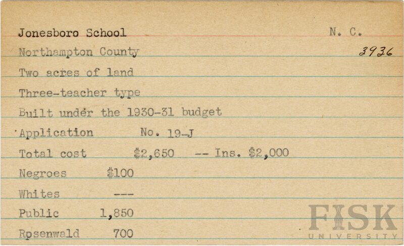 - School card for Jonesboro School in Northampton County, North Carolina with a section added to the budget contributions that says, "Ins. $2,000"