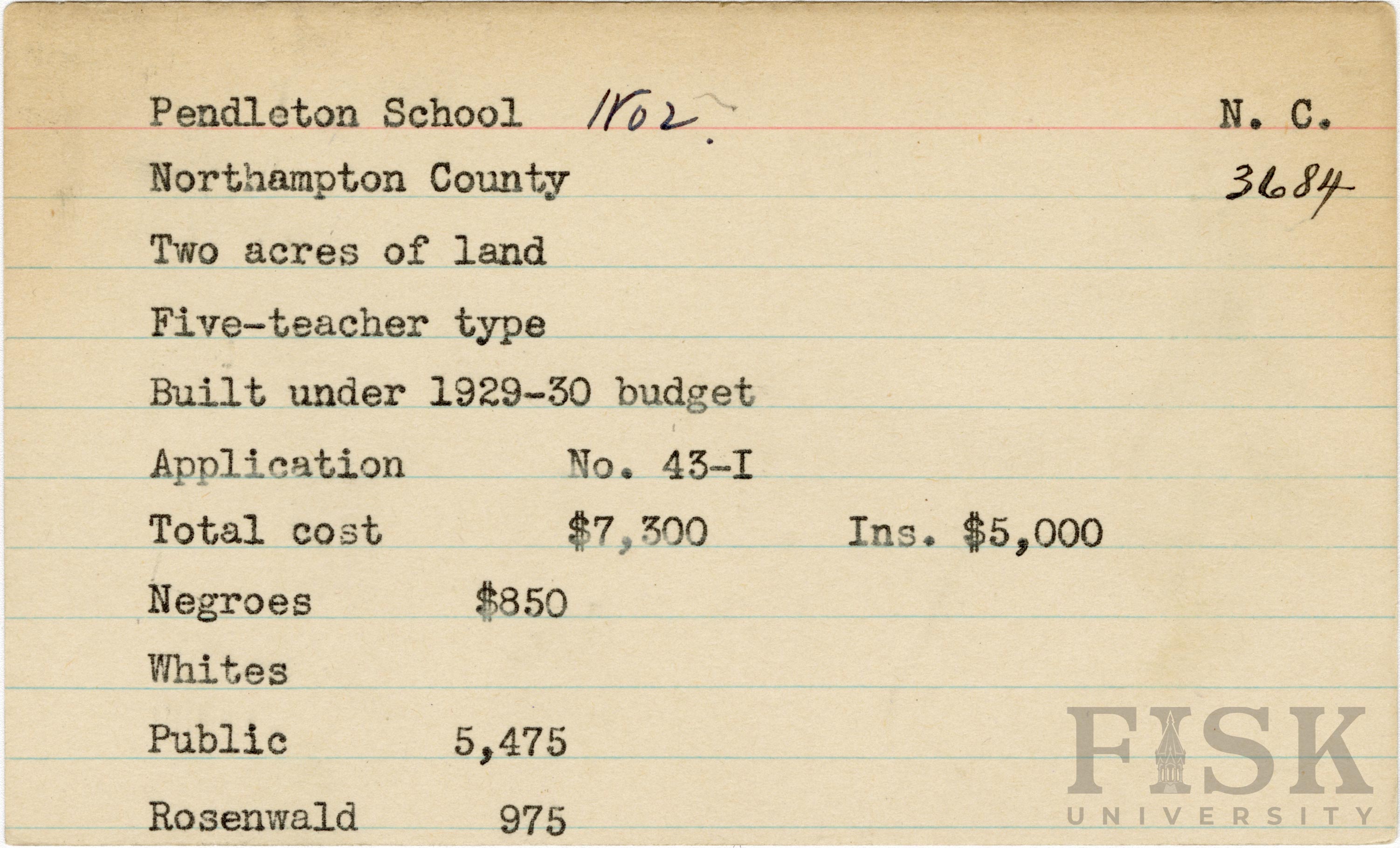 - School card for Pendleton School in Northampton County, North Carolina with a section added to the budget contributions that says, "Ins. $5,000"