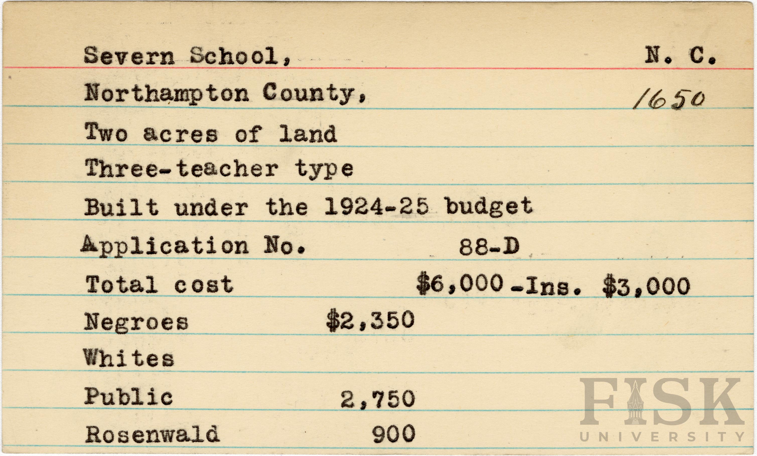 - School card for Severn School in Northampton County, North Carolina with a section added to the budget contributions that says, "Ins. $3,000"