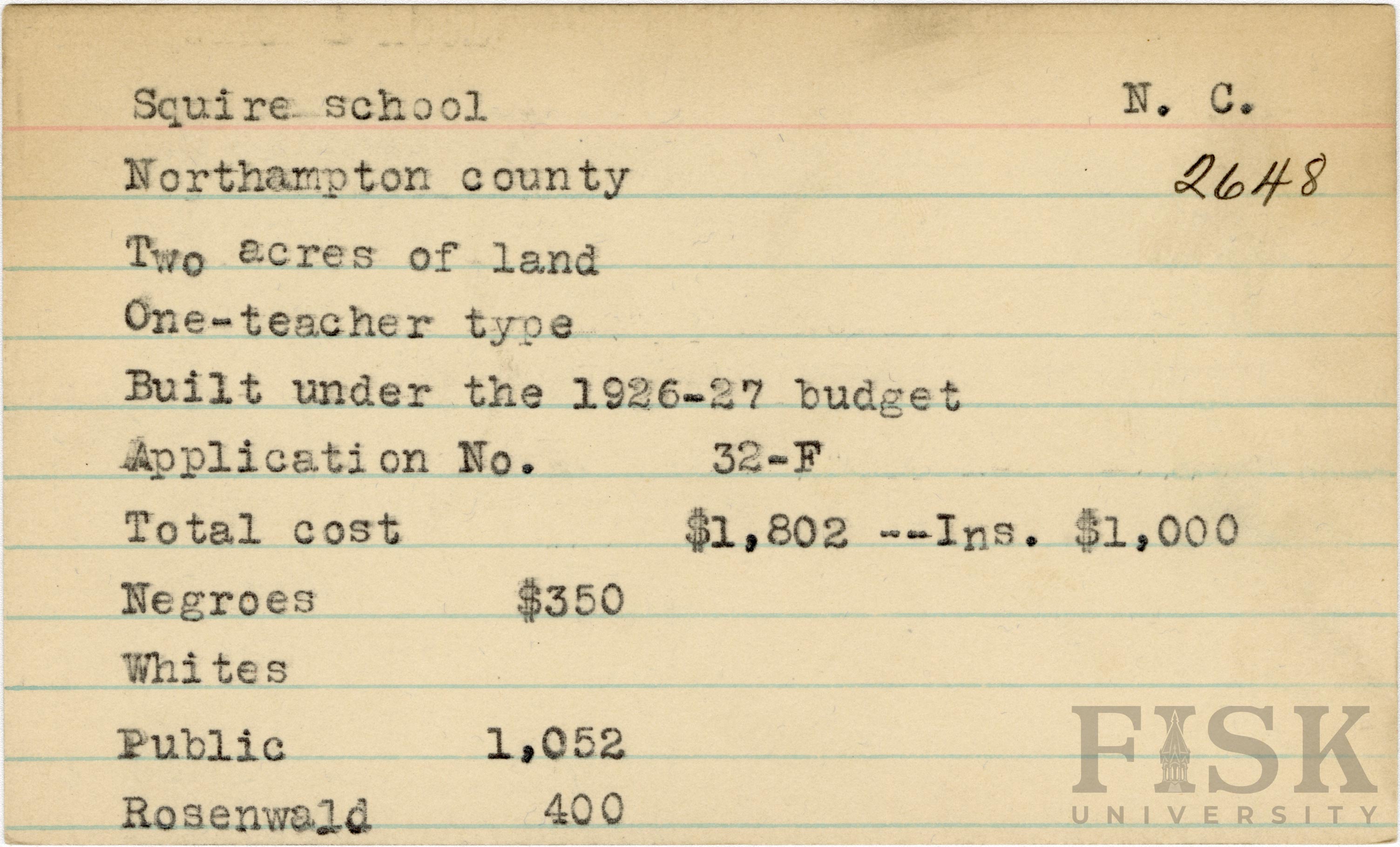- School card for Squire School in Northampton County, North Carolina with a section added to the budget contributions that says, "Ins. $1,000"
