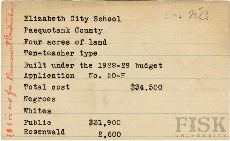 School card for Elizabeth City School in Pasquotank County, North Carolina with a handwritten note on the far left of the card that says, "($500 aid for permanent construction)"