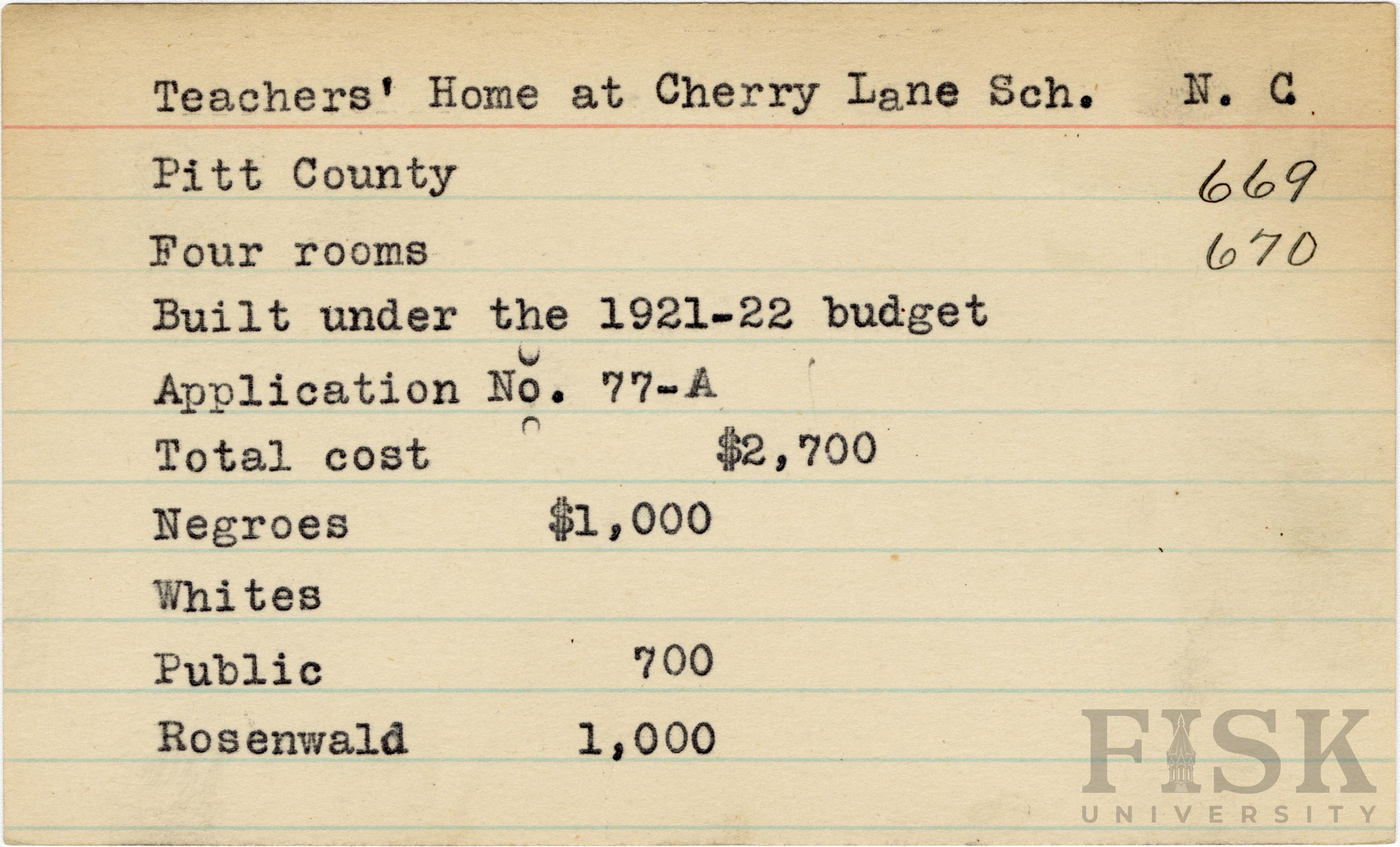 - School card for the four room teacher's home at Cherry Lane School in Pitt County, North Carolina with a handwritten note on the card that says, "Home at this school"
