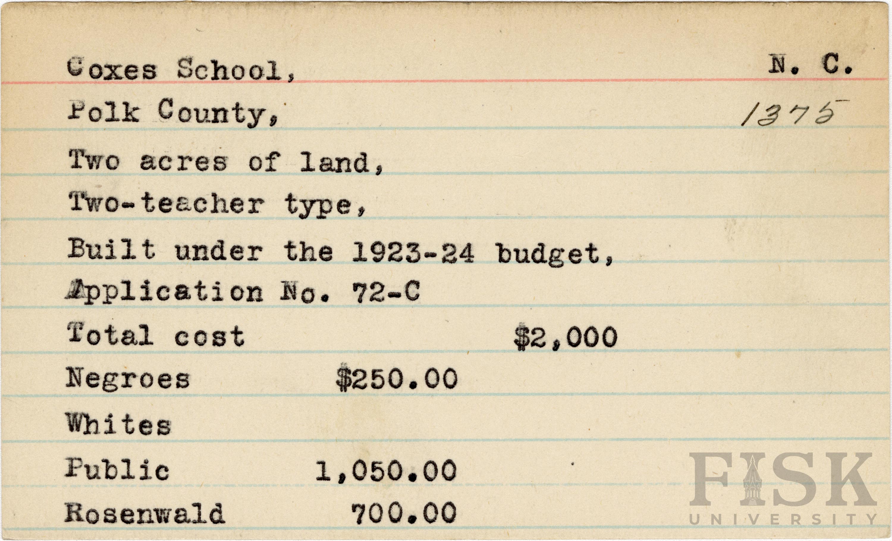 - Julius Rosenwald Fund--Buildings, African American schools--History--20th century, African American schools--Coxes School