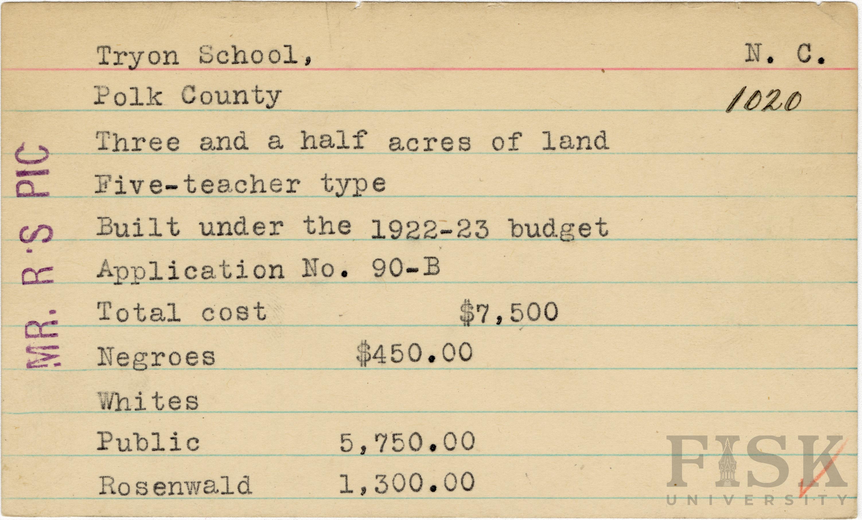 School card for Tryon School in Polk County, North Carolina with a note on the far left of the card that says, "Mr. R's Pic"