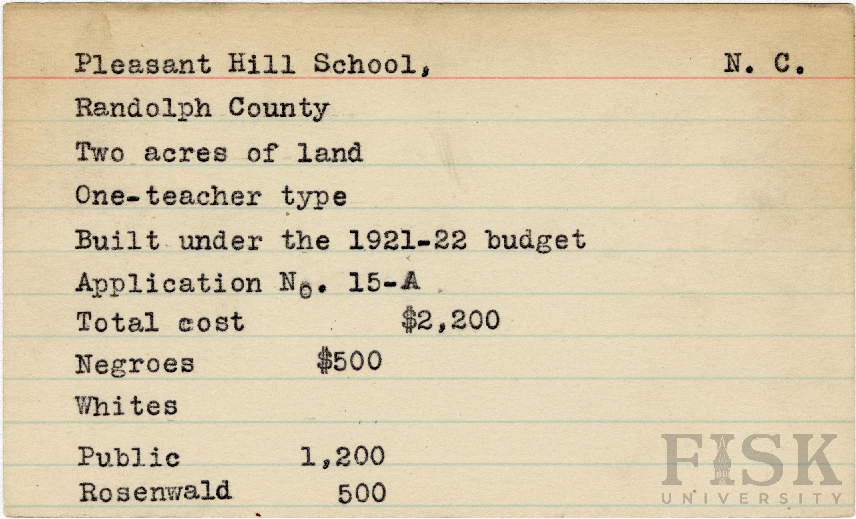- Julius Rosenwald Fund--Buildings, African American schools--History--20th century, African American schools--Pleasant Hill School