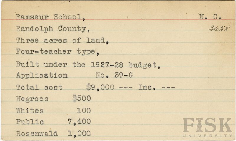 - Julius Rosenwald Fund--Buildings, African American schools--History--20th century, African American schools--Ramseur School