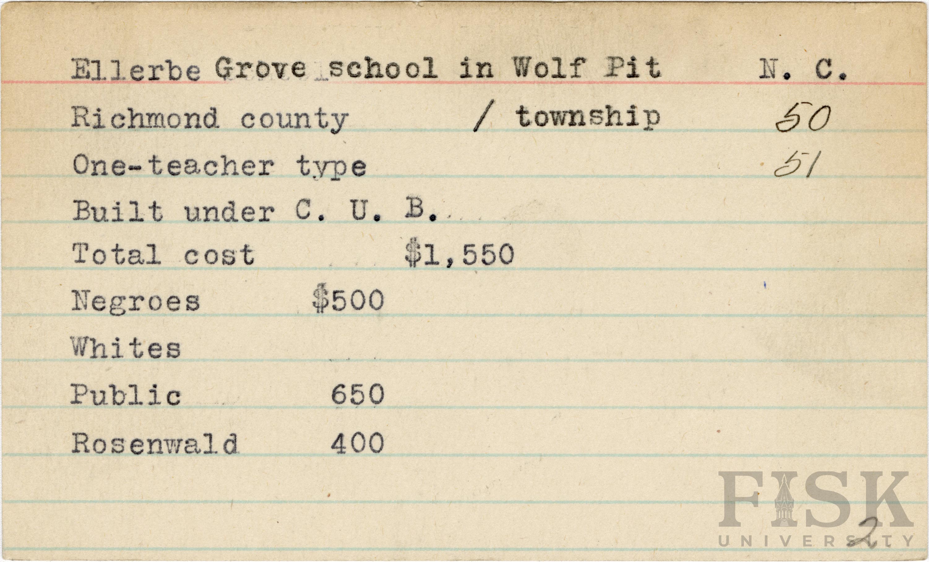- Julius Rosenwald Fund--Buildings, African American schools--History--20th century, African American schools--Ellerbe Grove School in Wolf Pit Township