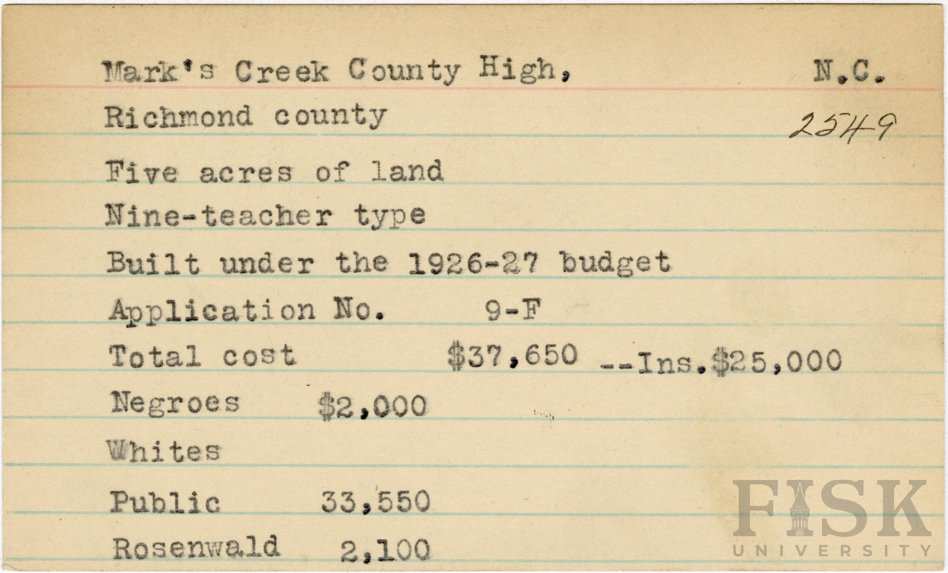 - Julius Rosenwald Fund--Buildings, African American schools--History--20th century, African American schools--Mark's Creek County High School