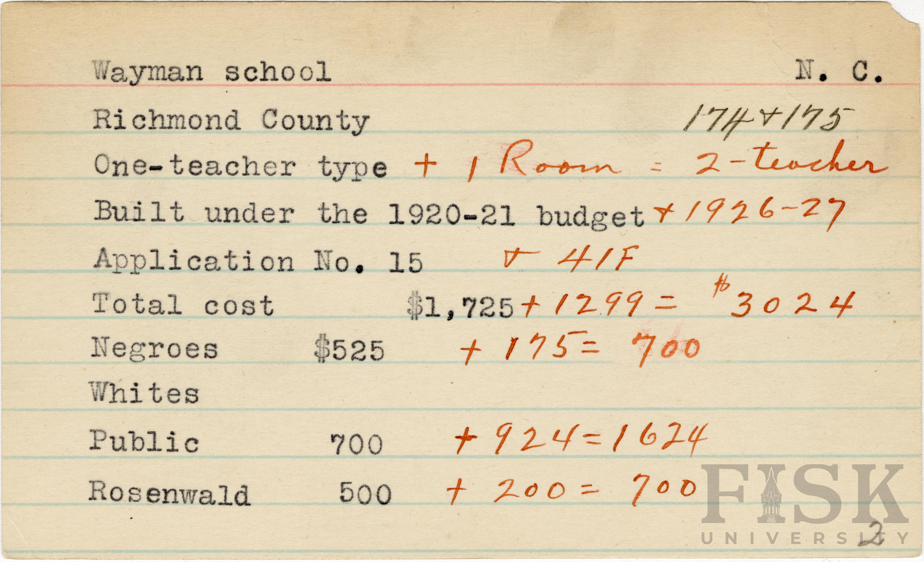 - School card for Wayman School in Richmond County, North Carolina with handwritten additions to the teacher type, budget year, application number, and budget contribution sections