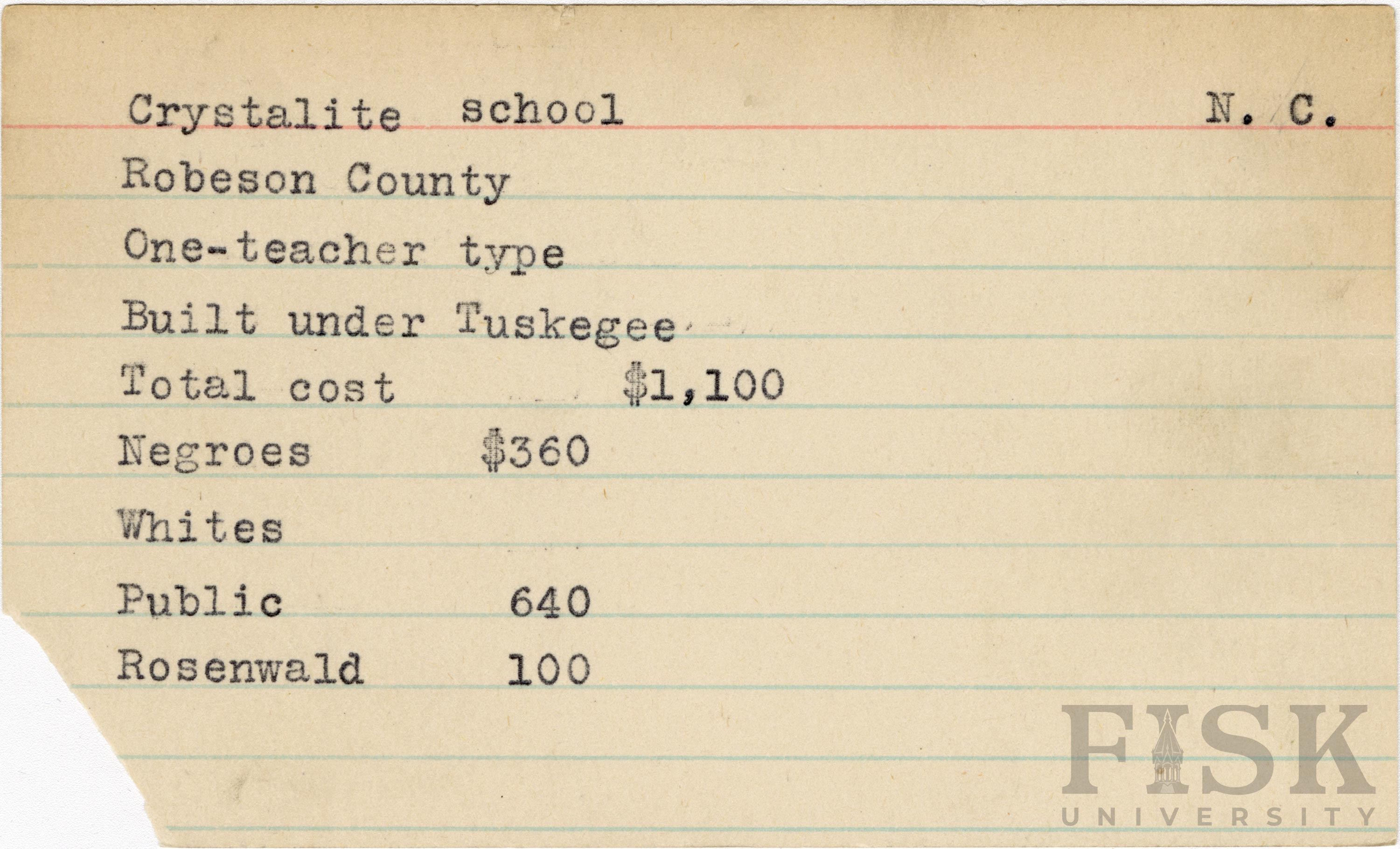 - Julius Rosenwald Fund--Buildings, African American schools--History--20th century, African American schools--Crystalite School