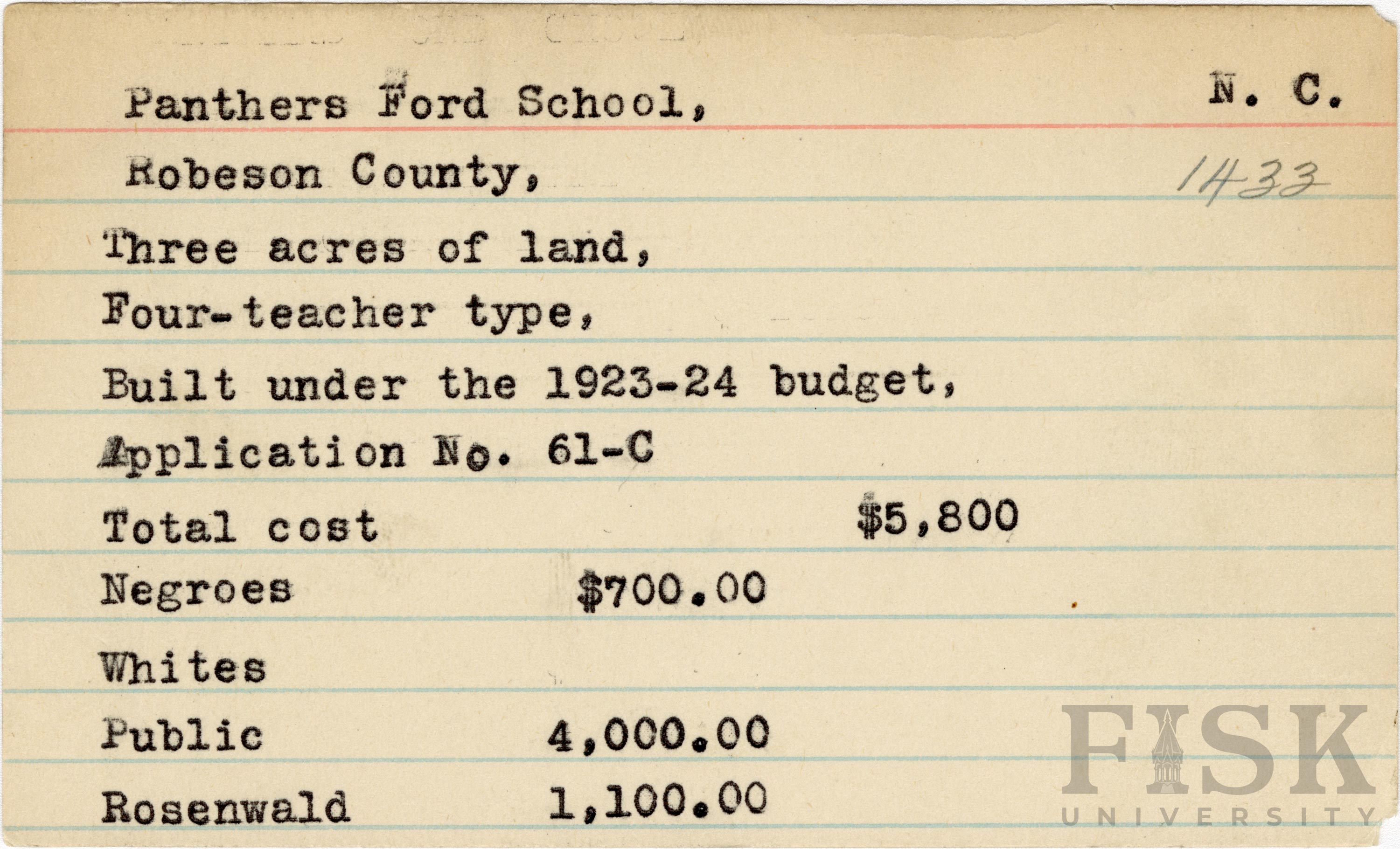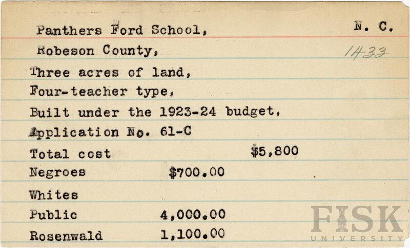 - School card for Panthers Ford School in Robeson County, North Carolina