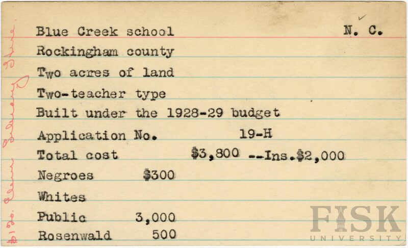 - Julius Rosenwald Fund--Buildings, African American schools--History--20th century, African American schools--Blue Creek School