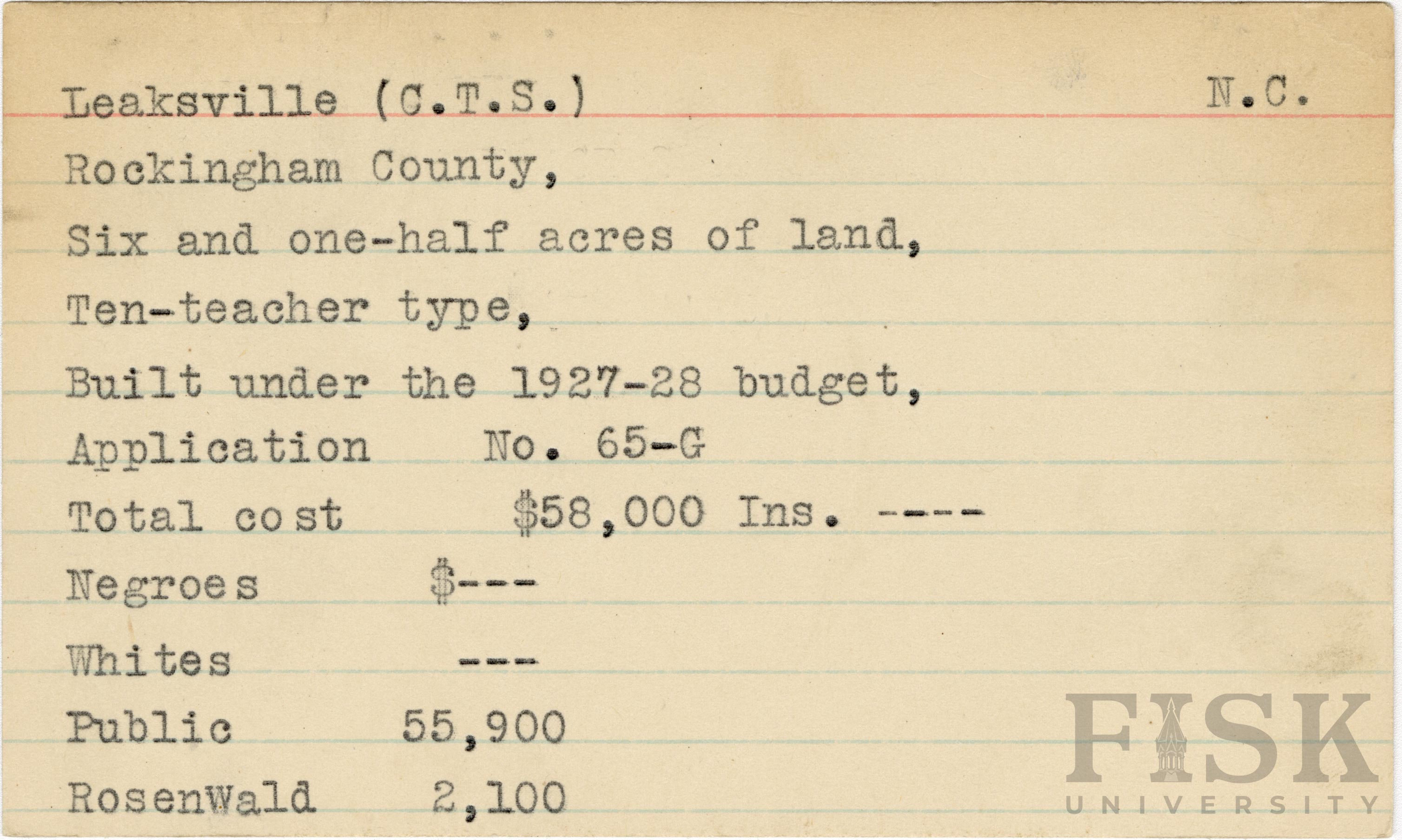 - Julius Rosenwald Fund--Buildings, African American schools--History--20th century, African American schools--Leaksville School
