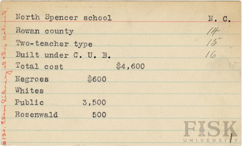 - School card for North Spencer School in Rowan County, North Carolina with a handwritten note on the far left of the card that says, "$120 elem library at this school"