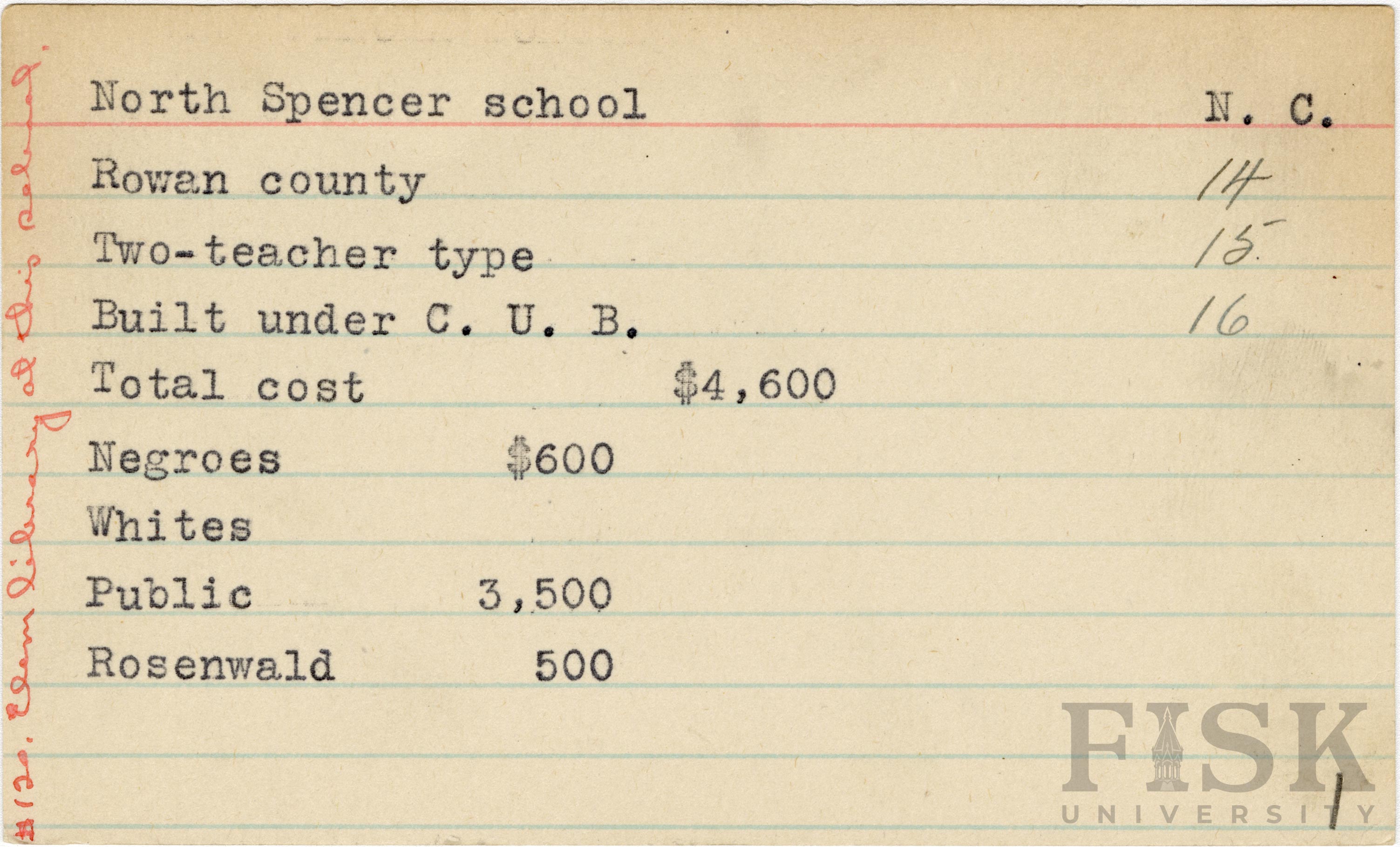 School card for North Spencer School in Rowan County, North Carolina with a handwritten note on the far left of the card that says, "$120 elem library at this school"
