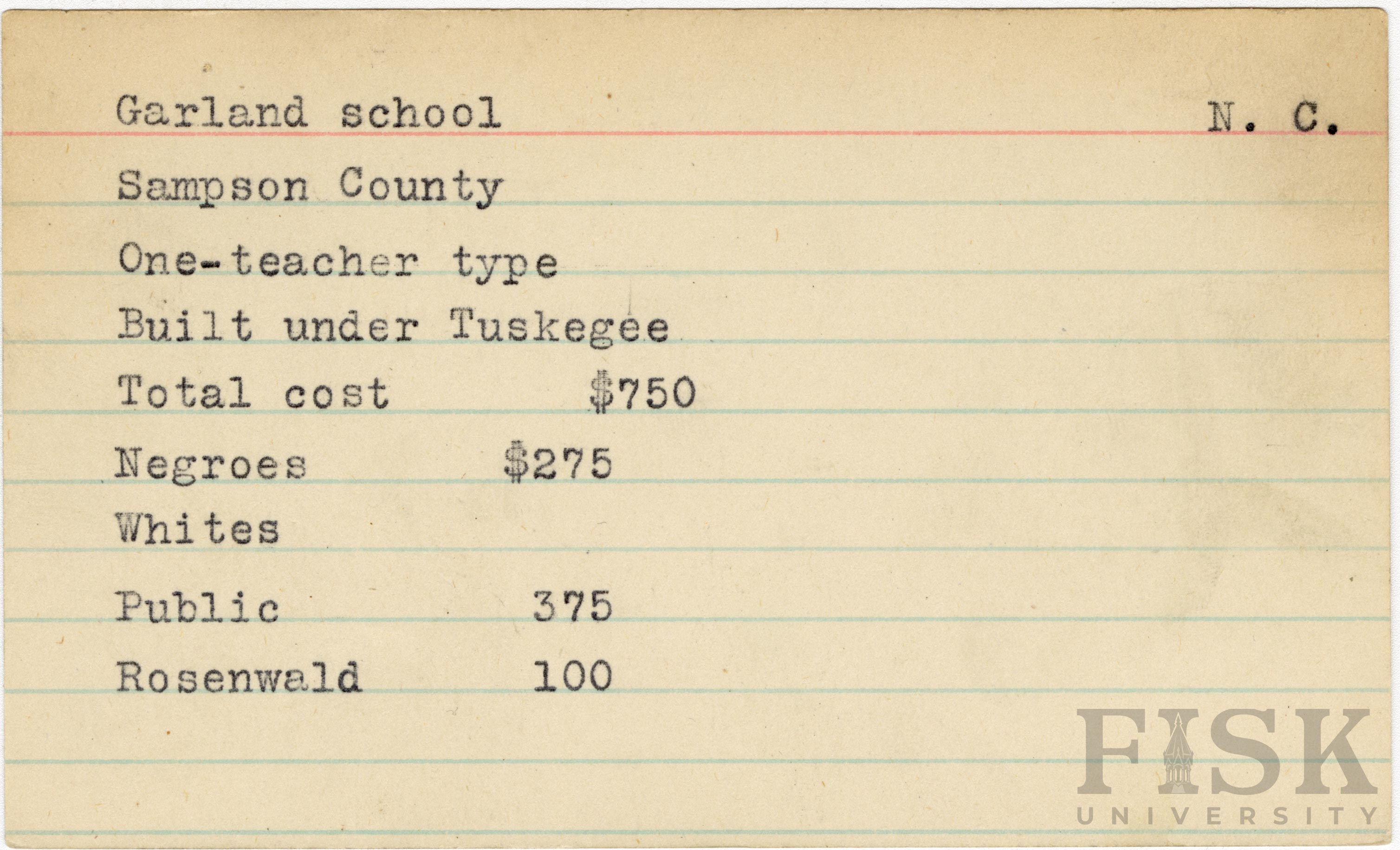 - Julius Rosenwald Fund--Buildings, African American schools--History--20th century, African American schools--Garland School