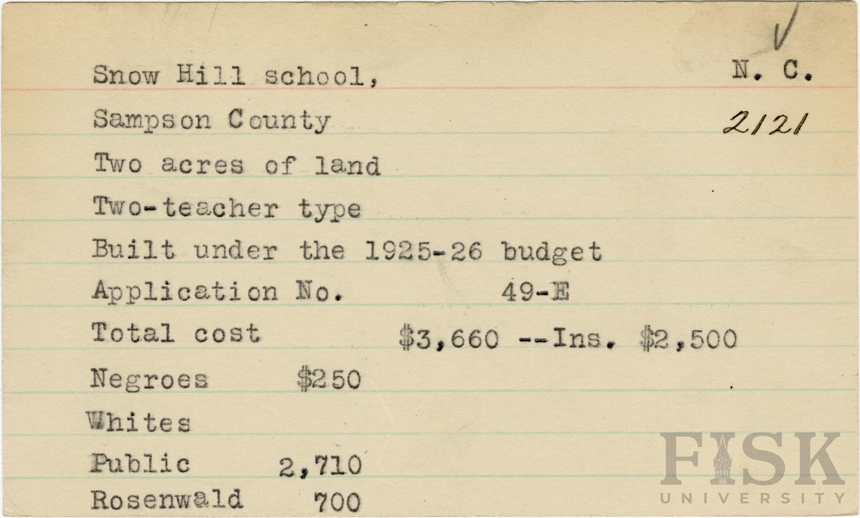 - Julius Rosenwald Fund--Buildings, African American schools--History--20th century, African American schools--Snow Hill School