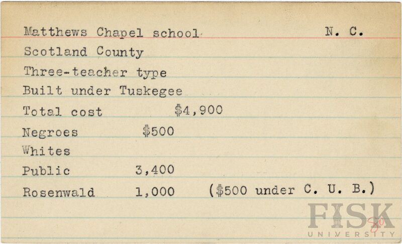 - School card for Matthews Chapel School in Scotland County, North Carolina with a note added next to the Rosenwald budget contribution that says, "($500 under C.U.B.)"