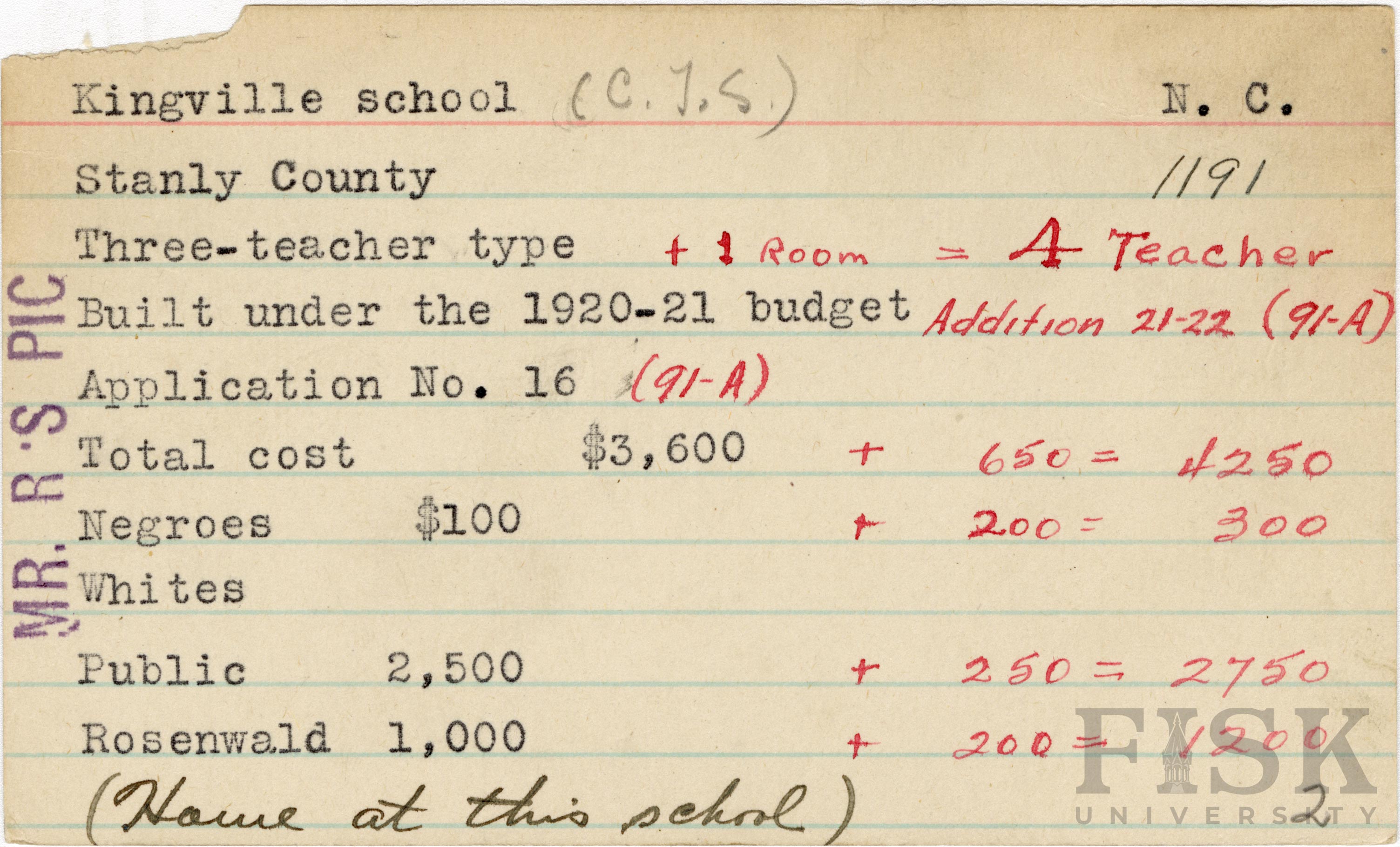 - School card for Kingville School in Stanly County, North Carolina with handwritten additions to the teacher type, budget year, application number, and budget contribution sections. Notes on the card say, "Mr. R's Pic" and "(Home at this school)"
