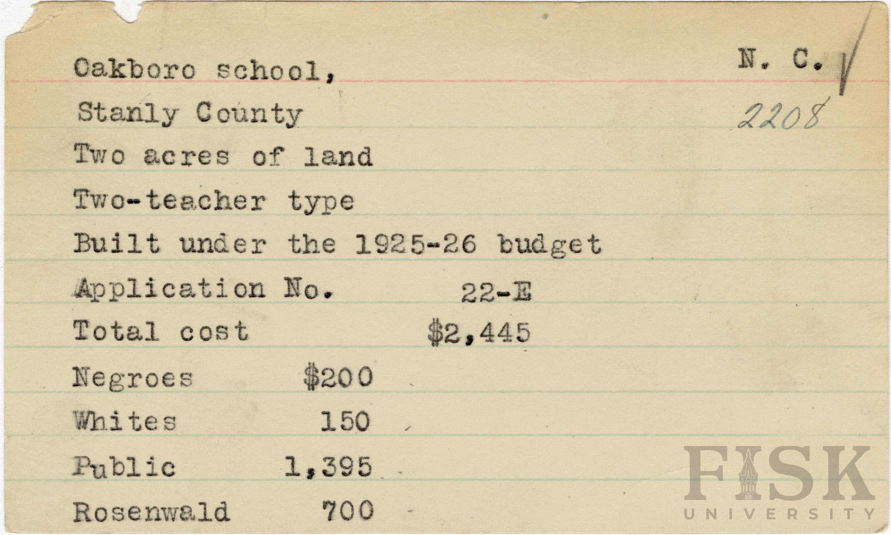 - Julius Rosenwald Fund--Buildings, African American schools--History--20th century, African American schools--Oakboro School