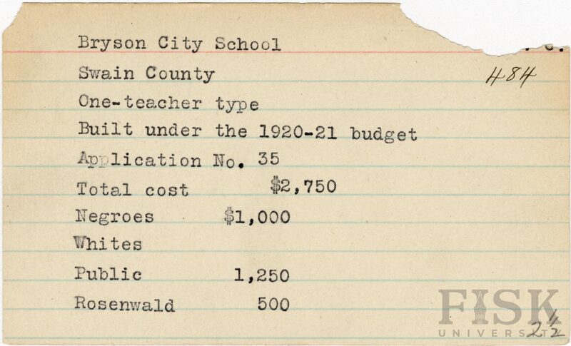 - Julius Rosenwald Fund--Buildings, African American schools--History--20th century, African American schools--Bryson City School