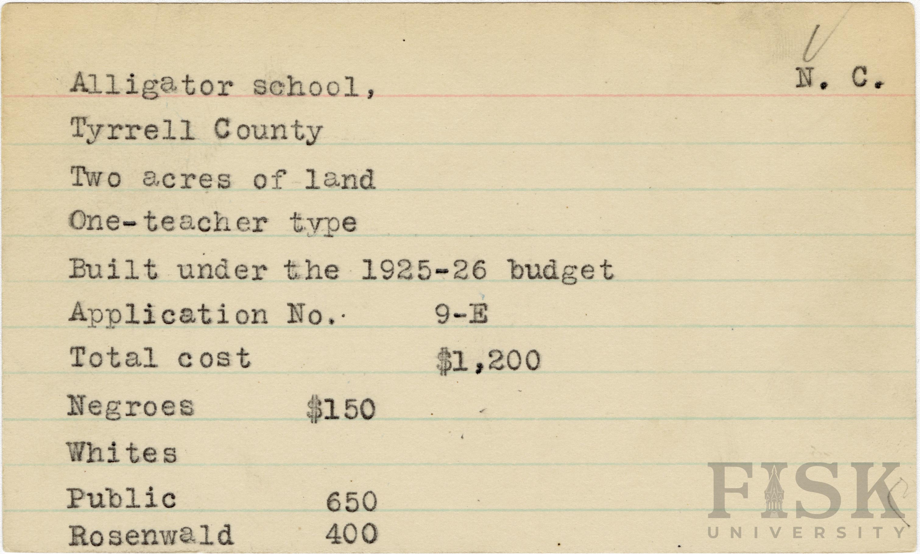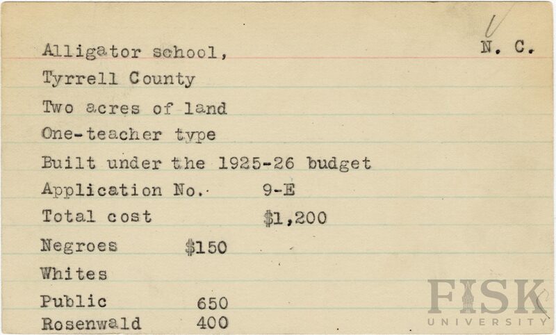 - School card for Alligator School in Tyrrell County, North Carolina