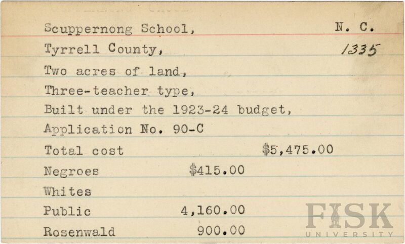 School card for Scuppernong School in Tyrrell County, North Carolina