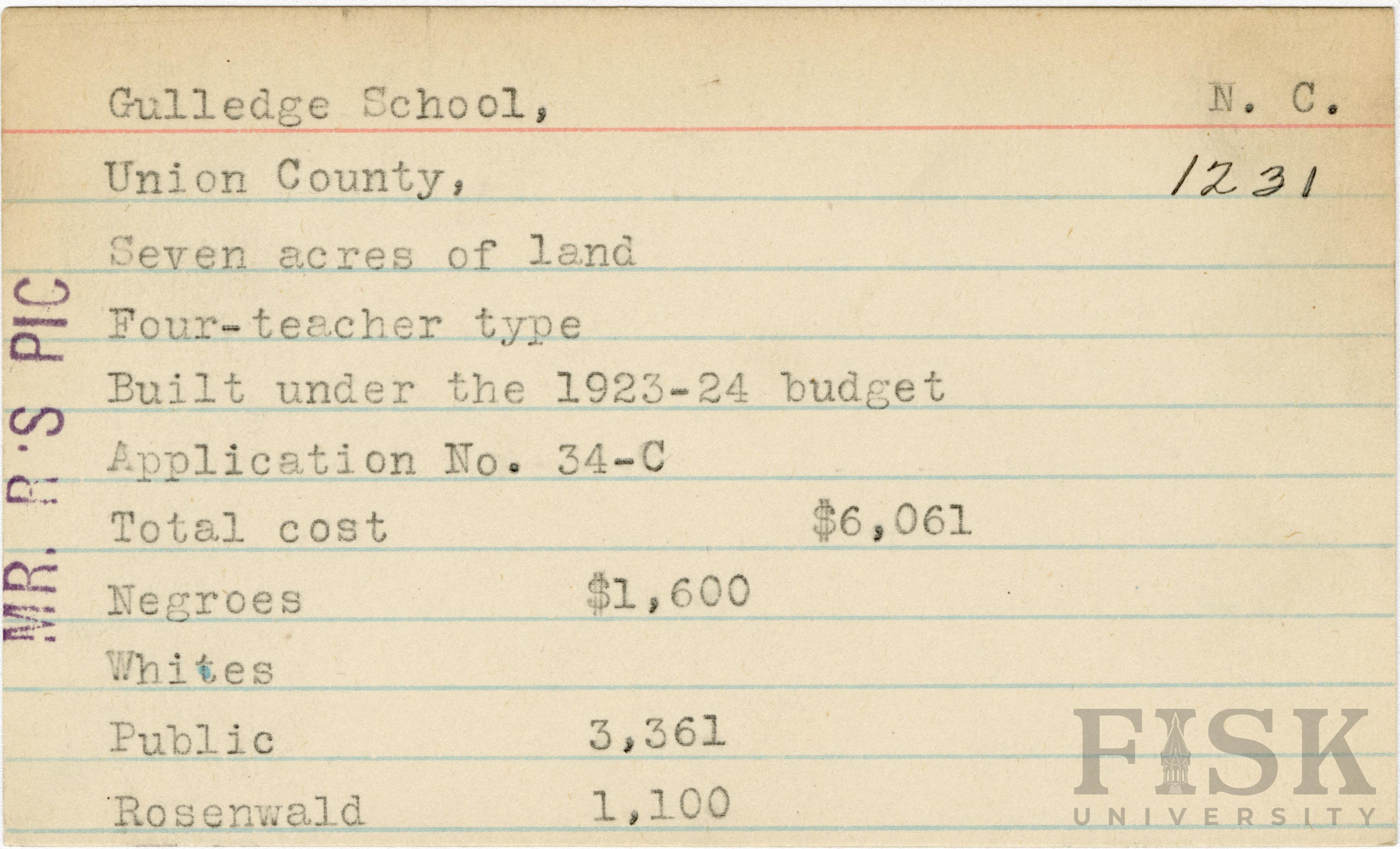 School card for Gulledge School in Union County, North Carolina with a note on the far left of the card that says, "Mr. R's Pic"
